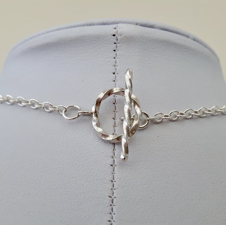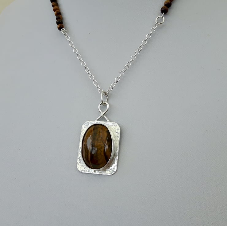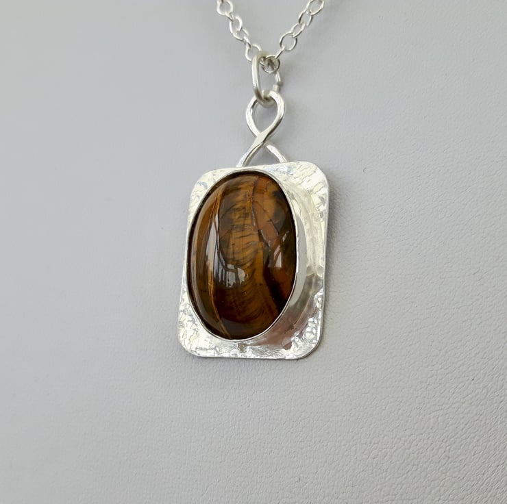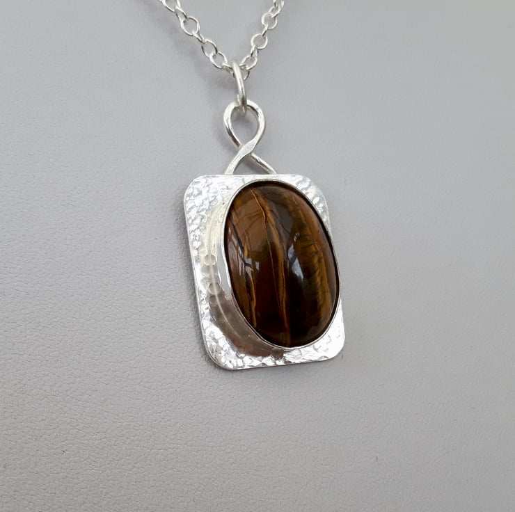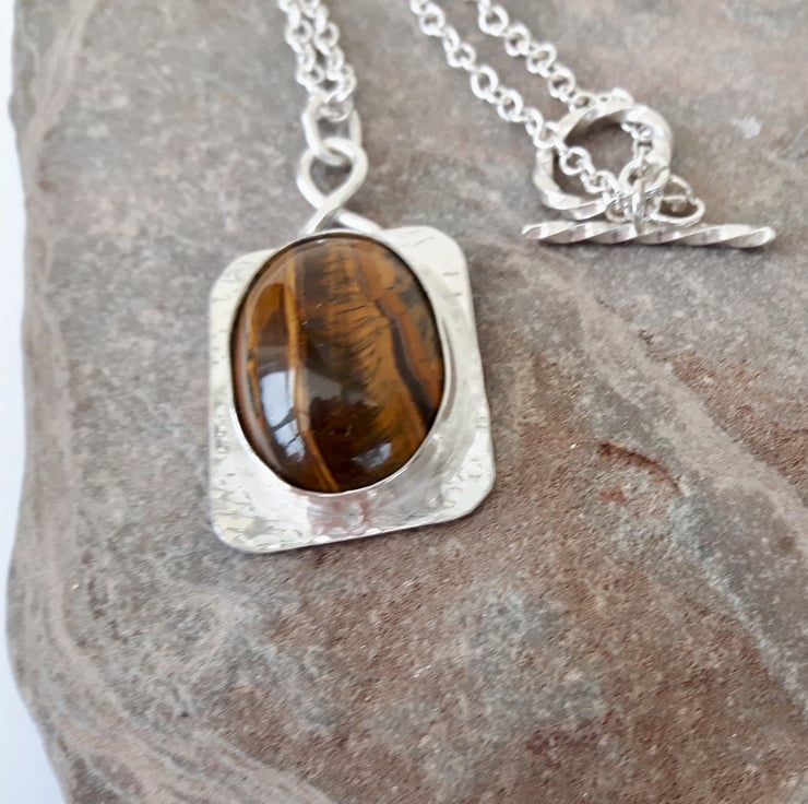 This stunning necklace features a chunky cabochon of golden tiger’s eye in a bezel setting mounted on a hammered rectangle of sterling silver sheet. The stone is beautifully marked in shades of gold, brown and black, with a magical shimmering cat’s eye effect, Traditional silver hallmarks including my own maker’s mark have been applied to the reverse side by the London Assay Office. The pendant has an integral loop bail and is attached to the chain by means of an oval ring, The chain is a robust sterling silver trace chain, sturdy enough to carry the weight of the pendant. I have added two lengths of silver wire bearing tiger’s eye beads to echo the colours in the main gemstone. The clasp is also handmade - a toggle and loop fastening made from sterling silver square wire which has been twisted into a spiral.