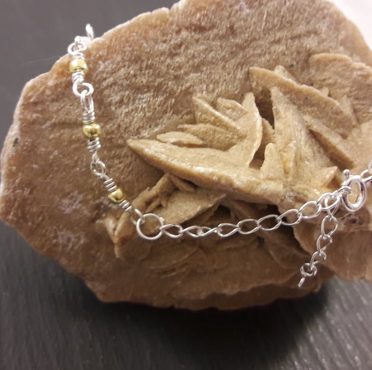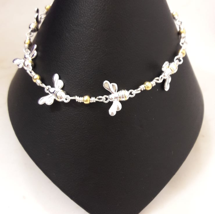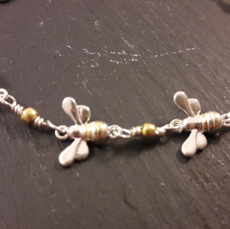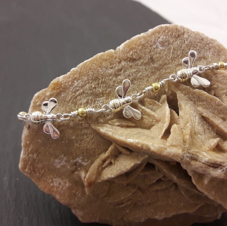 This gorgeous bracelet could be worn every day for a lifetime. It is made from sterling silver with 5 sterling silver bees, their stripes picked out in gold-plate, linked with sterling silver wire and a gold-plated sterling silver beads. It is finished with a sterling silver bolt ring clasp and extender chain, which can be worn from 7 to 9 inches.