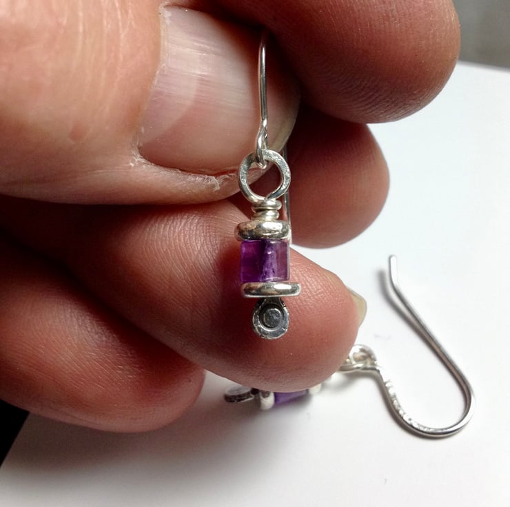 Forged sterling silver pins have been threaded through 5mm silver washer beads and bright Purple amethyst heishi.