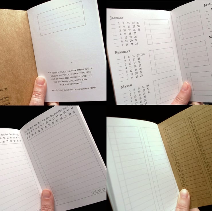 The cover-collage of postage stamps is individually glued into place with an acid-free, xylene-free adhesive then coated with a matt sealant for extra protection. The cover is coated with a matt sealant. The inner front is signed & dated.