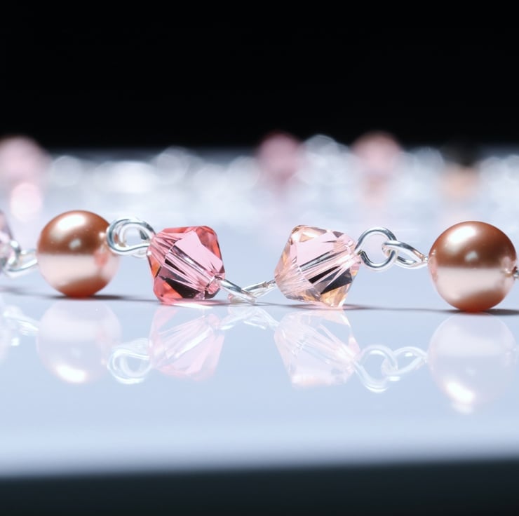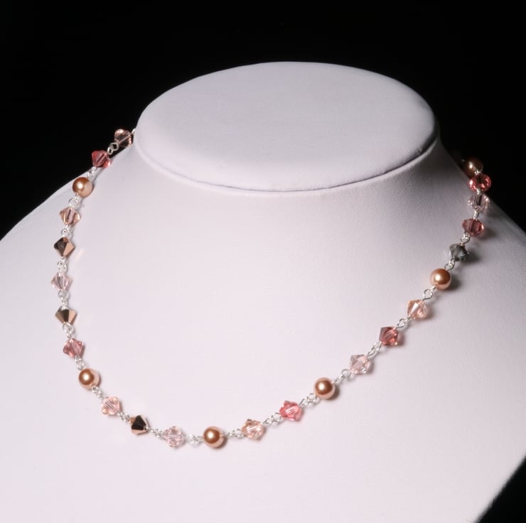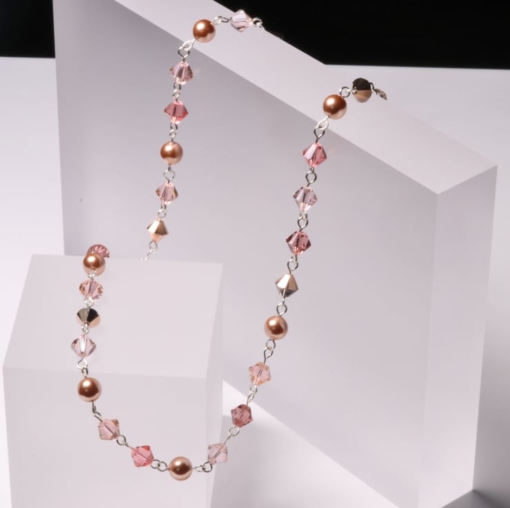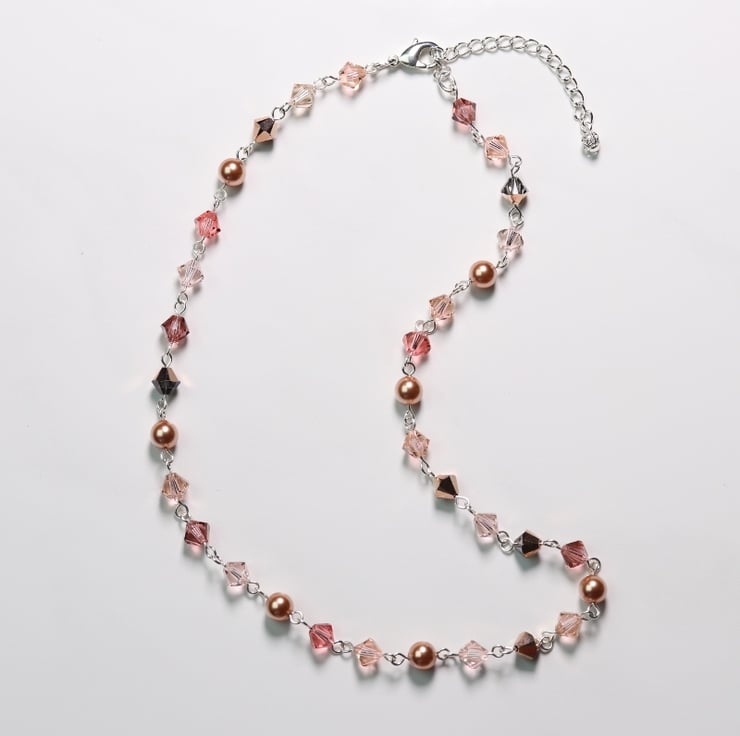 A pretty necklace in Swarovski crystals and pearly beads in shades of rose gold and complementary colours. This necklace is part of my mix and match rose gold range. The 6mm bicone (Xilion) crystals and Swarovski crystal ‘pearls’ are in different peachy pink and pale bronze colours linked by silver-plated eyepins.