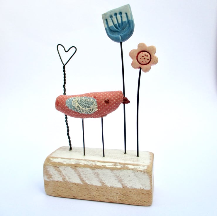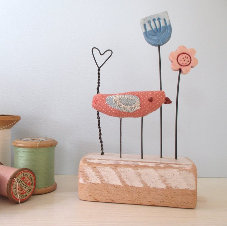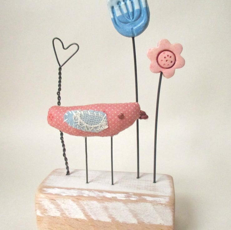 This hand stitched little fabric bird has a wing stitched from a tiny fabric scrap and two little wire legs. It is perched on a sanded, painted and waxed wood block.