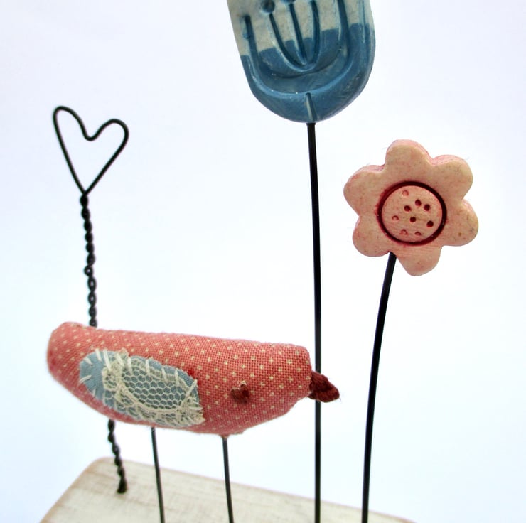 This piece is one of a kind, created from my love of making, exploring and mixing different materials to make a pretty scene that brightens any day.
