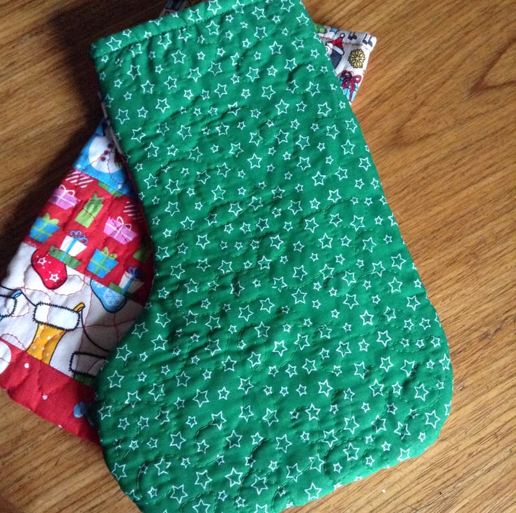 A little stocking made from Christmas fabrics and quilted in light blue thread in a swirly pattern. The backing is green fabric with white stars and is quilted in green thread. The stocking is lined with cream calico. It measures 28cm tall by 19 cm wide across the foot, and has a red hanging loop.