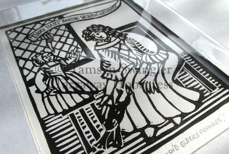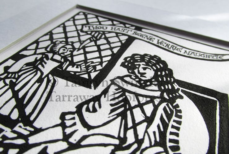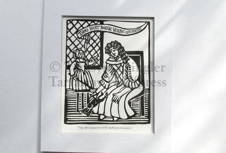 I very much love the illustrations and woodcuts accompanying chapbooks. There is a story entitled the World Tunrned Upside Down which I find very inspiring as I adore topsy turvy, anthropomorphic ideas, and these themes are used in Montol in Penzance also. This particular one is inspired by the children looking after and punishing their parents instead of the other way around ("Thou hast beene verrie naughtie" scolds the daughter to her mother - hand rendered) but I have a number of similar characters being pressed!