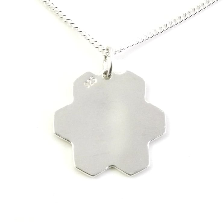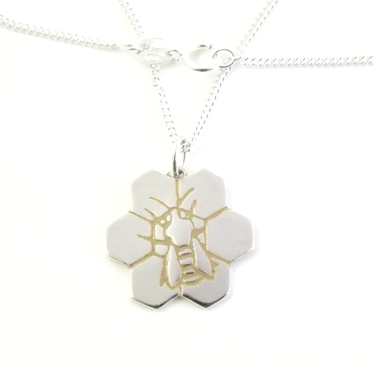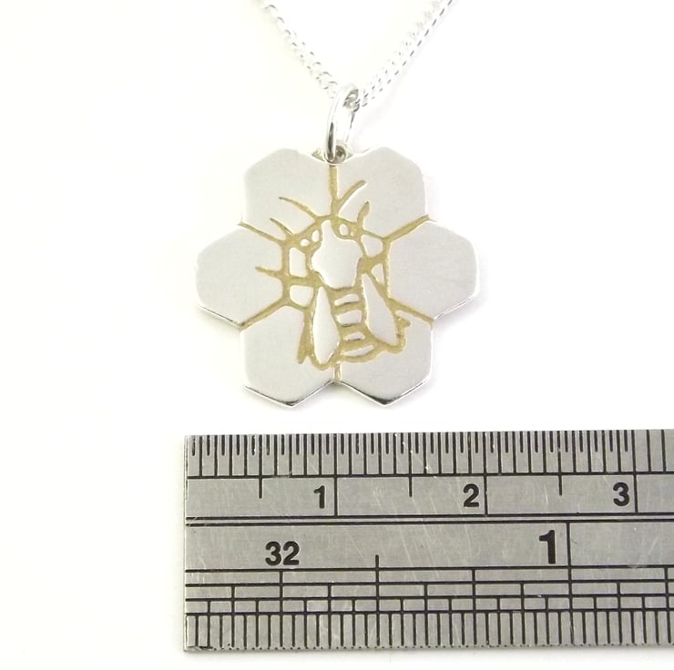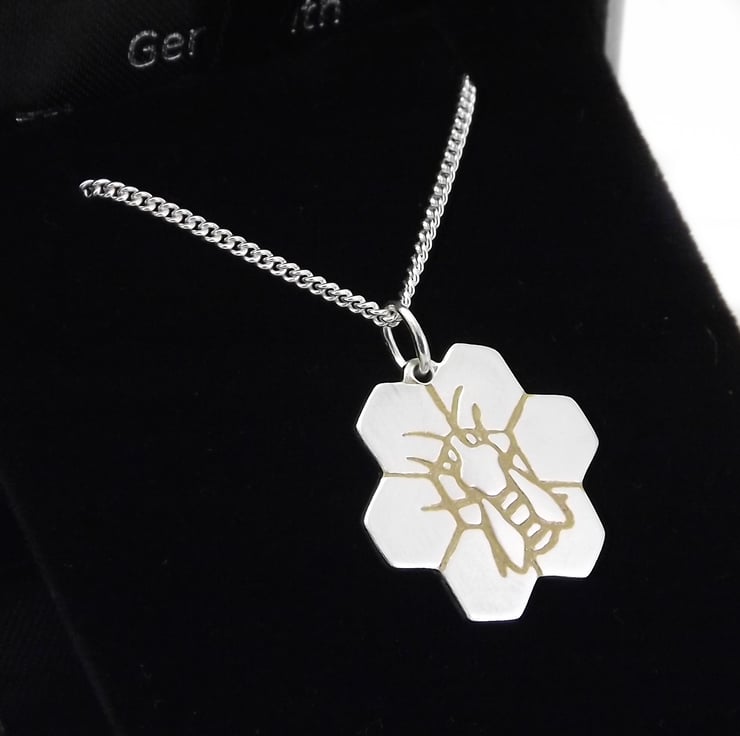This silver bee pendant has been lovingly handmade in Britain. It is crafted from recycled sterling silver sheet and is etched before being cut by hand, the edges are then smoothed using files and emery paper before it's carefully given its shape using a punch and hammer. A 5mm oval jump ring is then attached. A gold resin based enamel is added to the etched areas and then the pendant is polished before being attached to a chain.