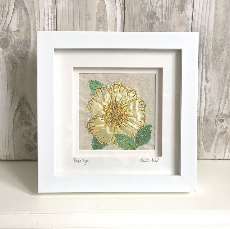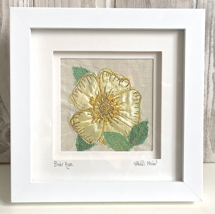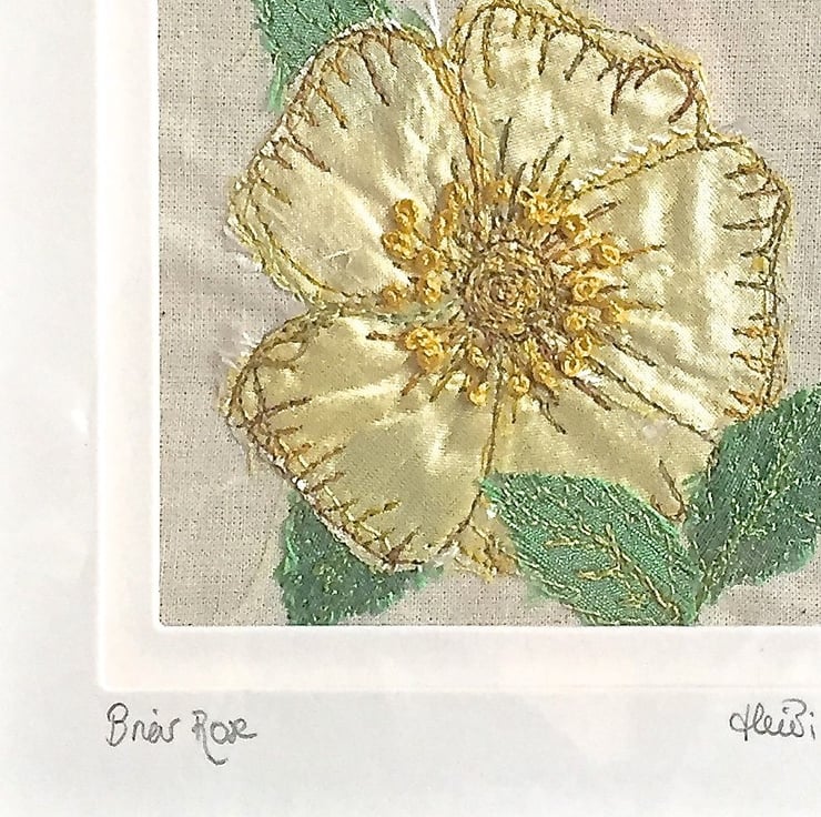 Briar rose textile artwork - a gorgeous wild dog rose cut from lemon silk for its petals and its leaves. Sewn onto calico with free style embroidery - which is where you use your sewing machine needle as a pencil and draw lines in thread, effectively painting in thread. The stamens are worked in hand embroidery.