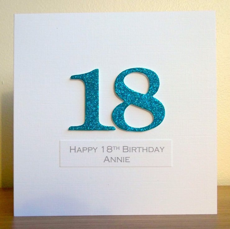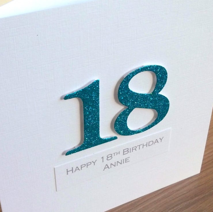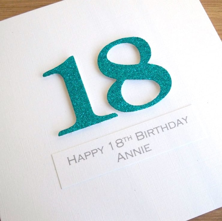 Featuring the number "18" die-cut from glitter card, with a personalised printed message.