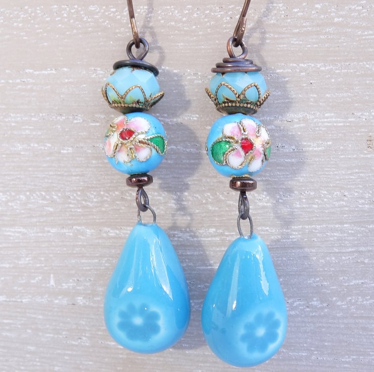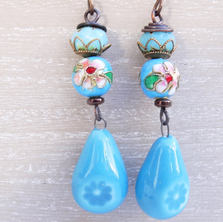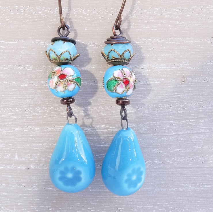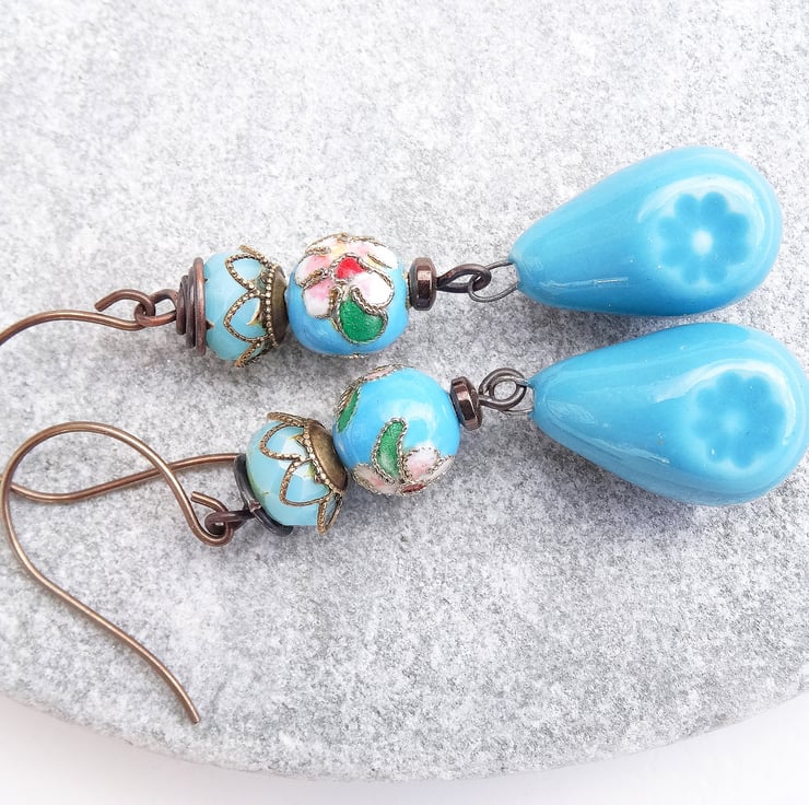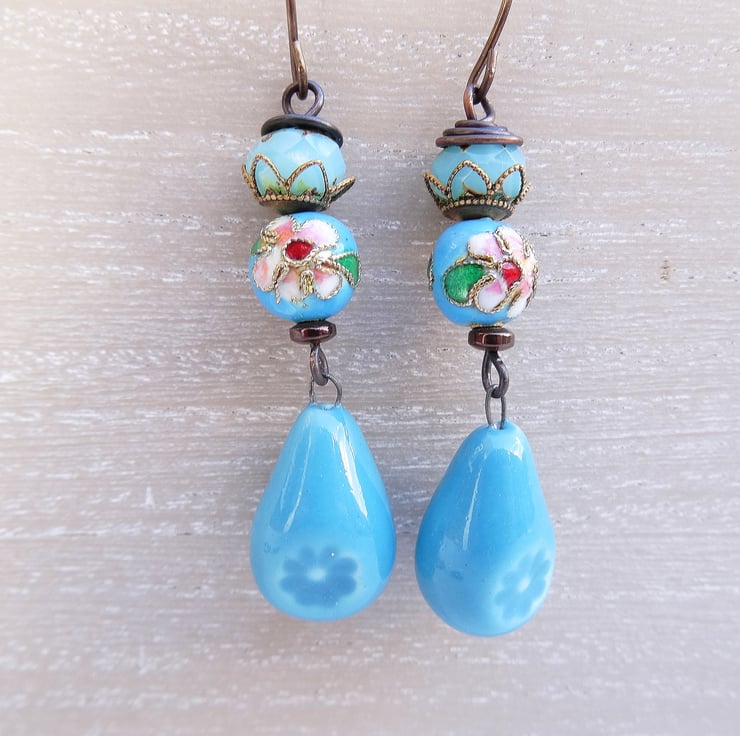 These earrings are so pretty. I have made them using handmade ceramic drops in a vivid turquoise blue. To these I have wired 10mm cloisonne round beads also in turquoise with a floral pattern and 8mm czech glass, faceted rondell beads in blue and capped with a filigree bead cap. The earrings measure 2.5 inches (just over 6cm) from top of vintaj brass, nickel free, round loop earwires.