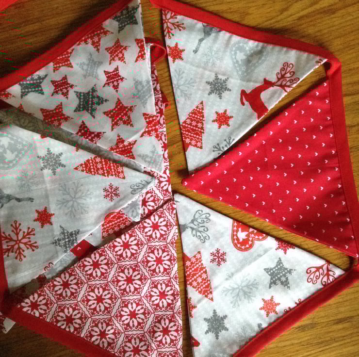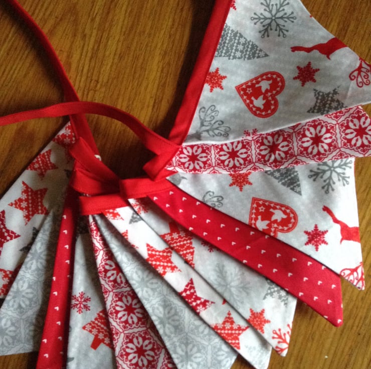Pretty scandi style fabric in reds, greys and white made into a string of bunting with red binding ribbon. The fabric features designs of stars, snowflakes, trees and deer, each flag is 14cm long and there are 12 on the string which measures 230cm long with ties at each end. It is double sided so can be hung across a room.