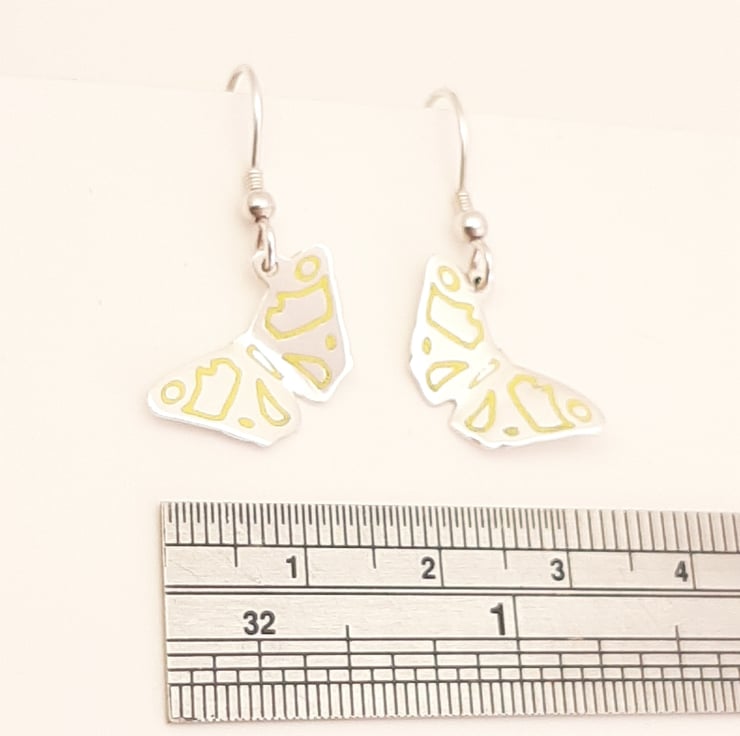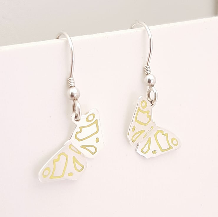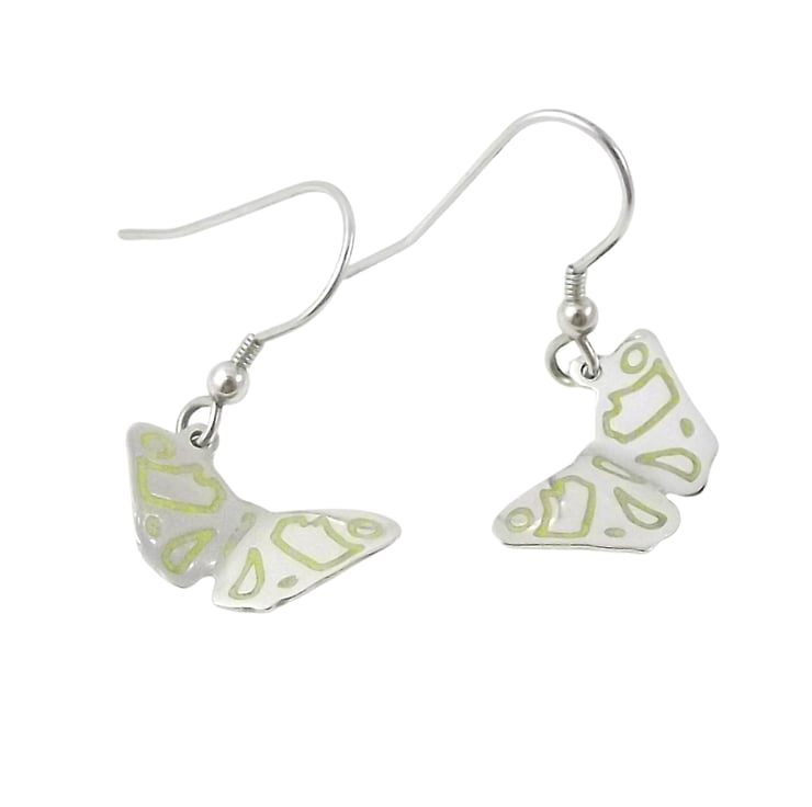 These butterfly drop earrings have been lovingly crafted from recycled sterling silver and are etched before being cut out by hand, the edges are then smoothed using files and emery paper before the earrings are carefully given their shape using parallel pliers. A coloured resin based enamel is added to the etched areas and then they are polished, before being attached to ear wires.