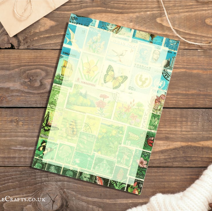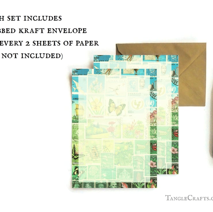 This letter set is decorated with a print of vintage world postage stamps collaged into an abstract landscape design: summery blue sky and rolling green hills filled with flowers and butterflies! The design is reproduced one of from my original art collages. The postal theme is nicely non-specific, suitable for many different purposes and occasions - perfect for all your snail mail correspondence!
