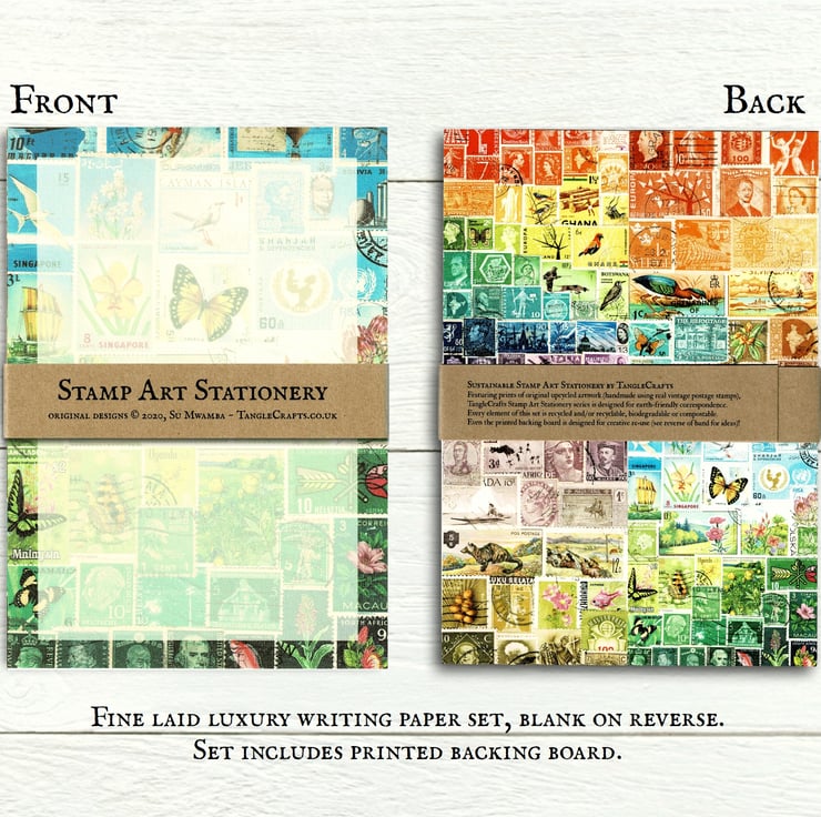 My first love is making collages from used, vintage postage stamps - creating new artwork from otherwise utterly disposable and unloved ephemera. The prints that these stationery designs are taken from were originally collaged directly onto notebooks which have since found new homes. It makes me happy to see the life of these artworks extended even further, and to find their way into the hands of letter writers who will appreciate their many glimpses into a forgotten postal history...