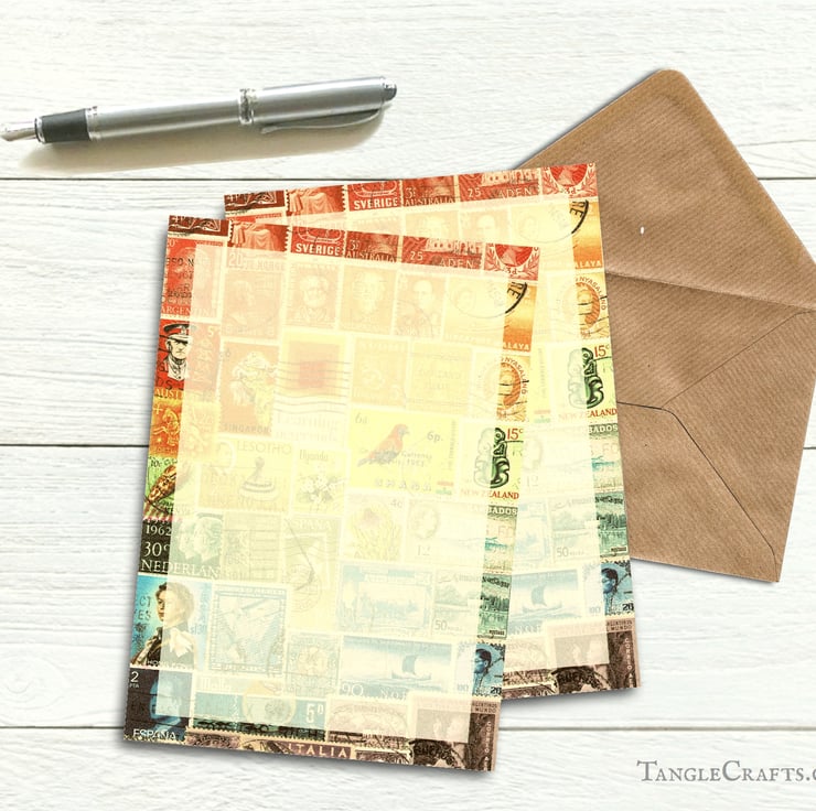 This colourful letter set is decorated with a print of vintage world postage stamps collaged into a blended spectrum of shades. The design is reproduced one of from my original art collages. The postal theme is nicely non-specific, suitable for many different purposes and occasions - perfect for keeping in touxh all your snail mail penpals, friends & family.