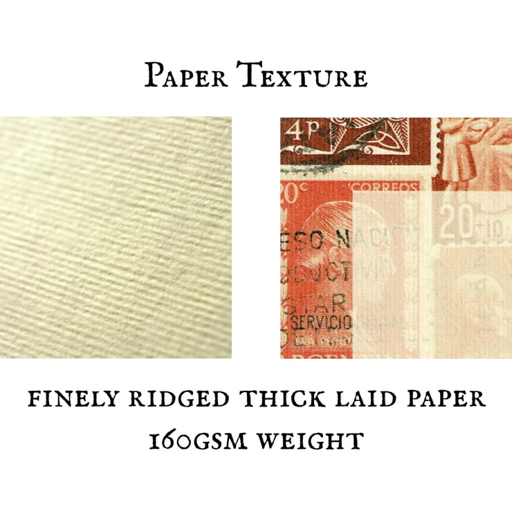 The sheets of writing paper are a luxurious, laid heavy weight (160gsm), thick & creamy 'acquerello' with a finely ridged but fountain pen friendly texture - beautiful to write on! Design is printed on one side only of A5 sheets (14.8 x 21cm).