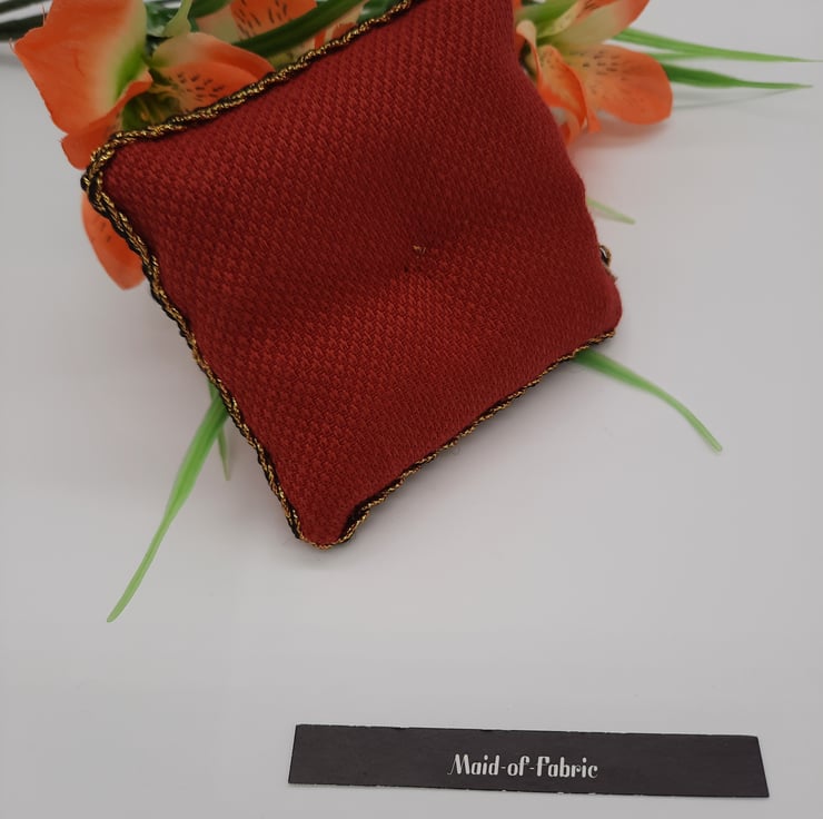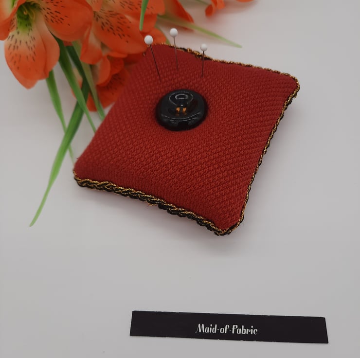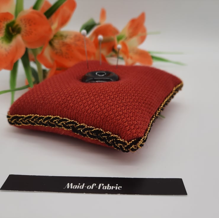 Pin cushion in red fabric with a black and gold trim.