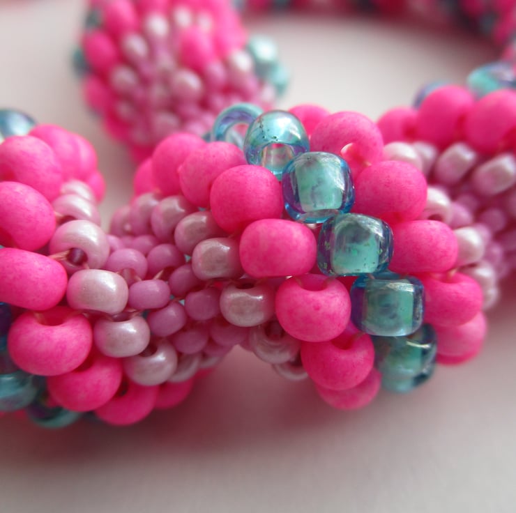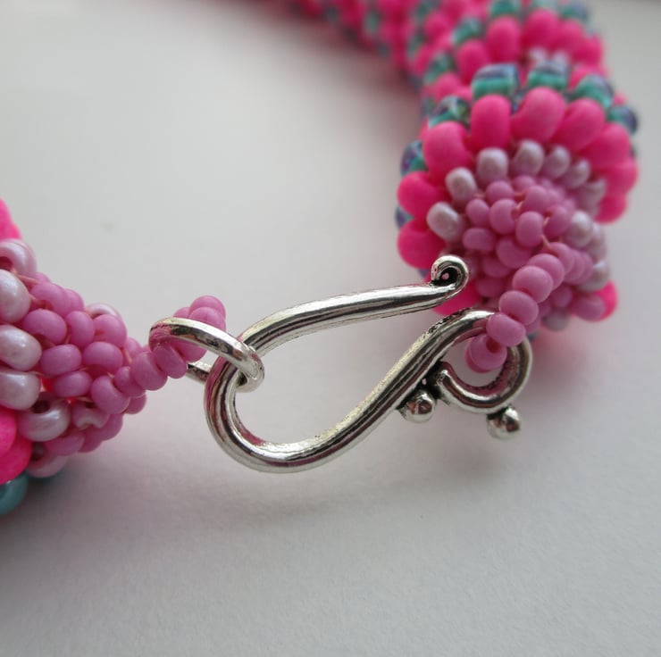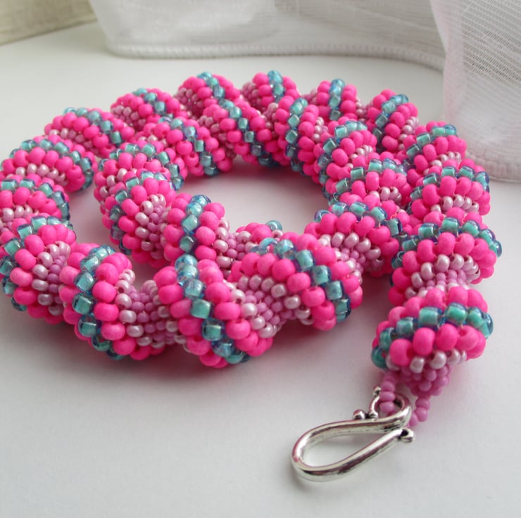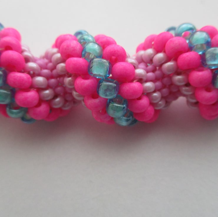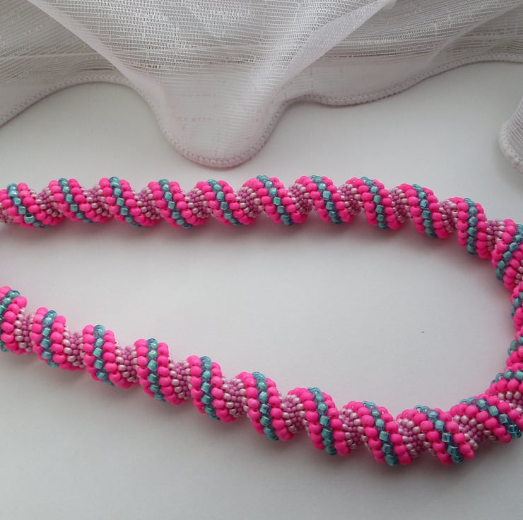 Hot pink and turquoise spiral necklace made with size 15,11,8 and 6 size seed beads, the graduation of the different sized seed beads makes the spiral and gives texture, the necklace is finished with an easy to fasten silver colour hook and eye.