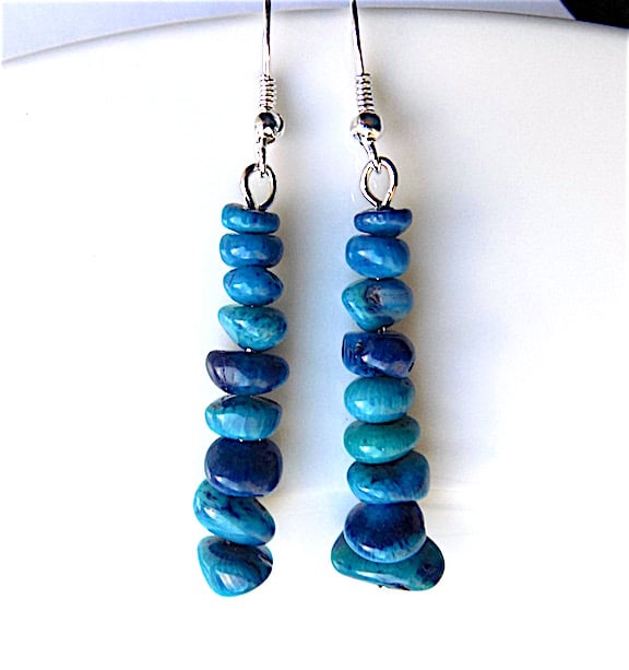 lovely blue coral dangle earrings for pierced ears, length 60 mm ( 6 cm ) branch coral from 5 to 12 mm. all fittings are silver plated. Coral has beautiful depth of colour and is a joy to wear.