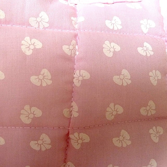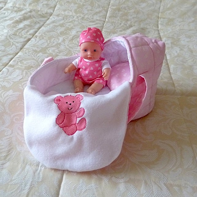 This pretty small doll's carrycot is made from pink polyester cotton which has a small bow design.