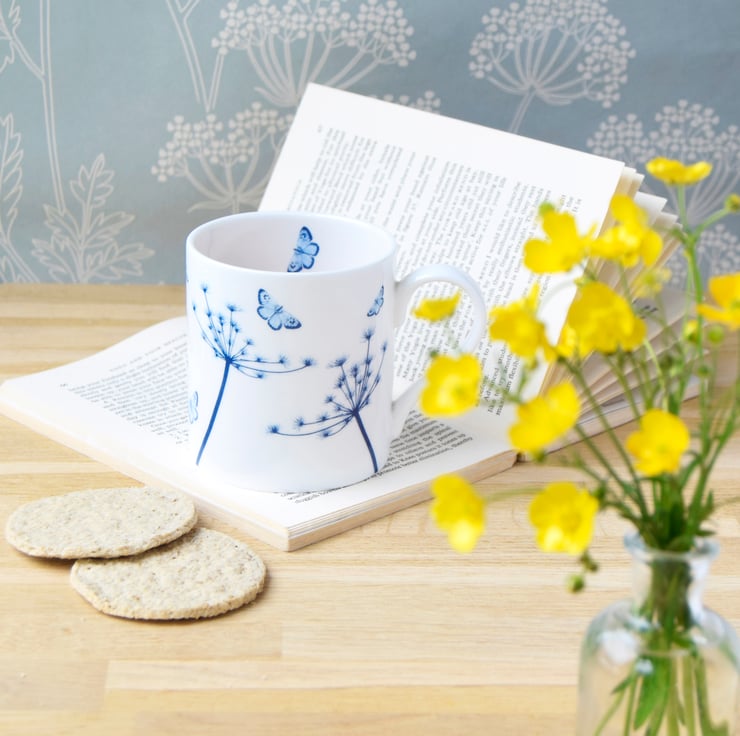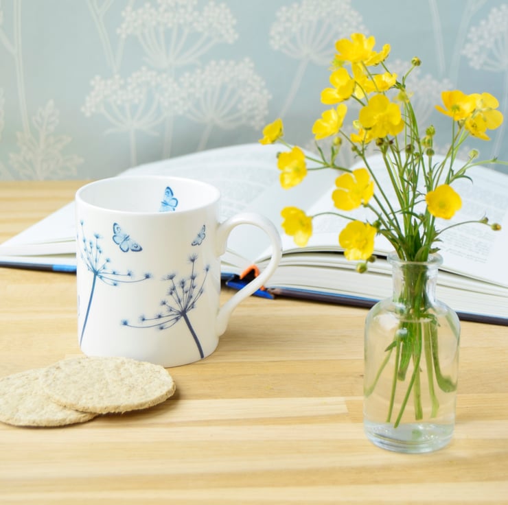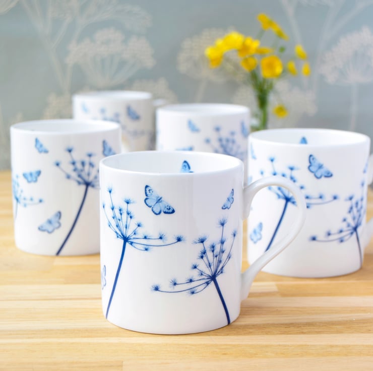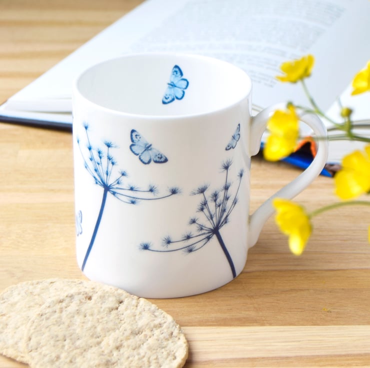 The delicate silhouettes of Cow Parsley seed heads with small blue butterflies fluttering around them are depicted on this pretty blue and white fine bone china mug. The design originates from my original Cyanotype creations inspired by the lovely delicate seed heads in the British hedgerows.