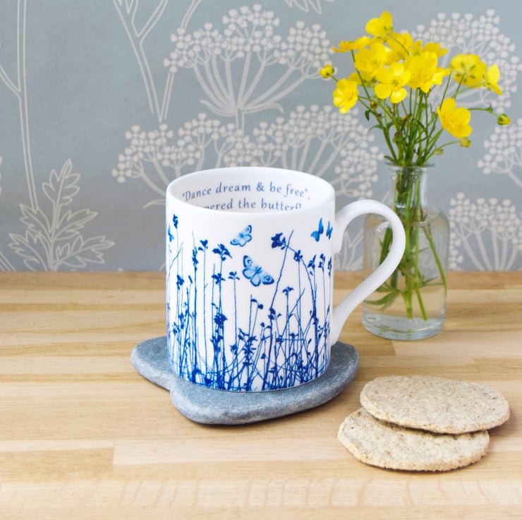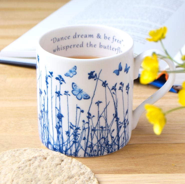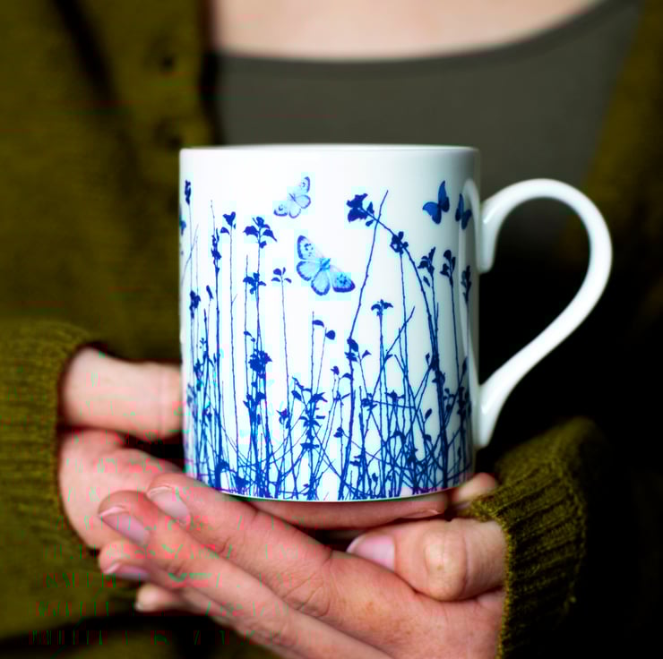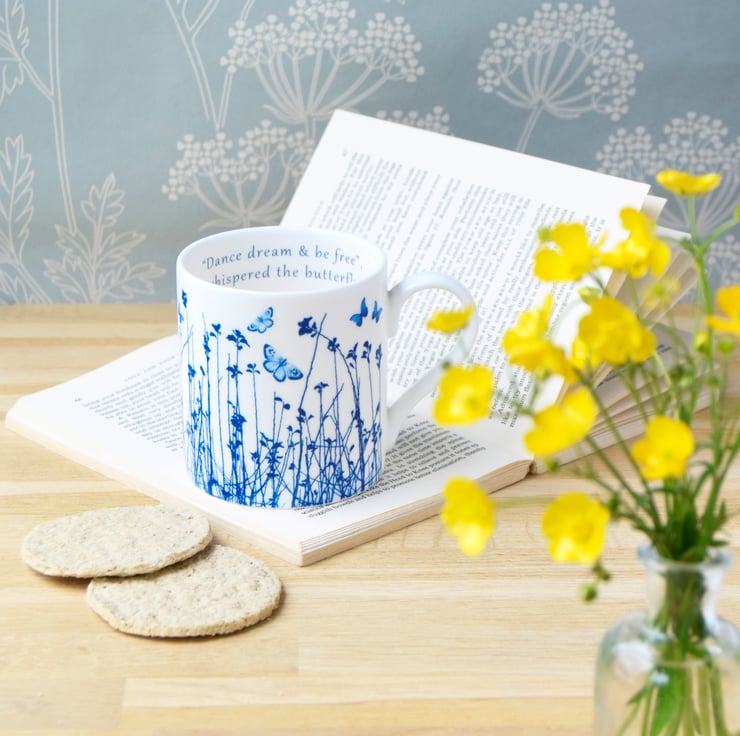 Pretty blue and white fine bone china mug depicting delicate blue butterflies fluttering over an intricate meadow design. Inspired by butterflies fluttering up out of tall grasses when walking through meadows on a sweet Summer's day.