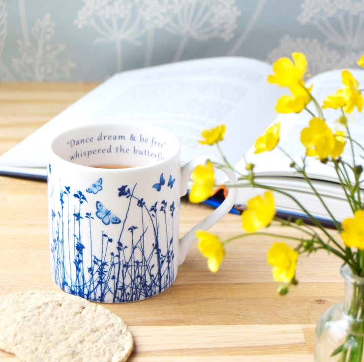 Fine bone china mug, blue butterfly meadow mug, Coffee mug, Secret Santa