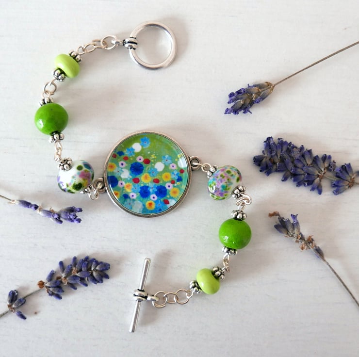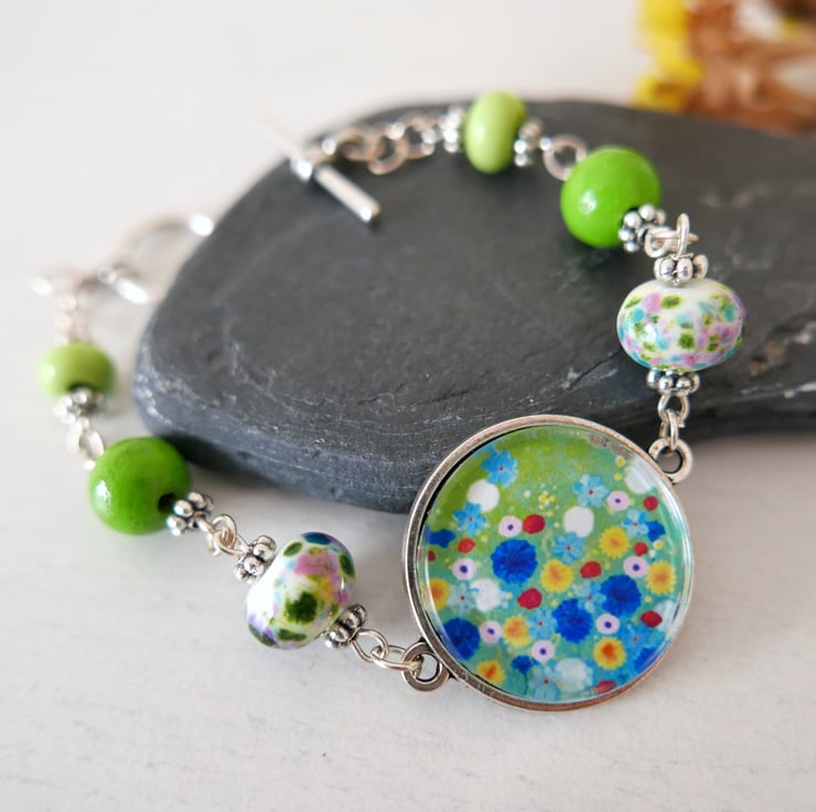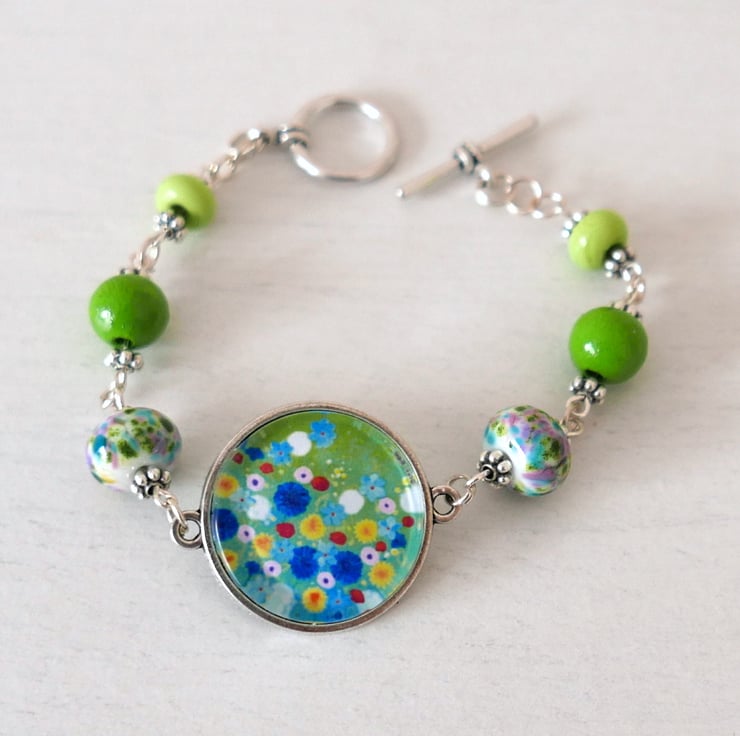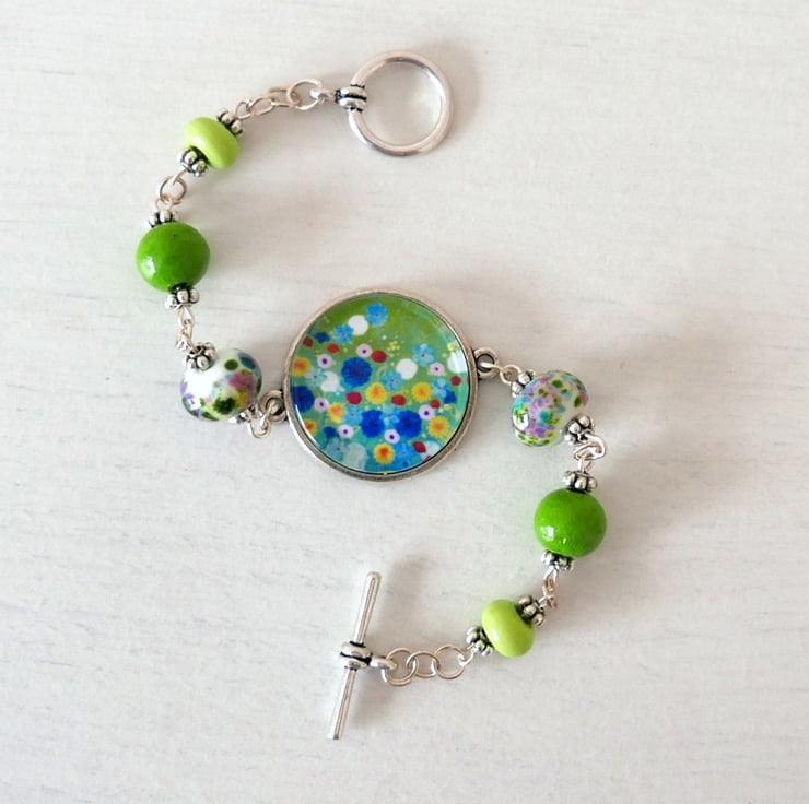 I made this green floral bracelet using a 1" round meadow art pendant connector with a print after one of my original paintings. I also used 2 multicoloured lampwork beads, 2 green wooden beads and 2 green lampwork beads to complement the colours and the style of the image. The bracelet is approx 7.60" long and it closes with a toggle clasp. Please let me know if you want the bracelet longer so I can adjust it at no extra cost.