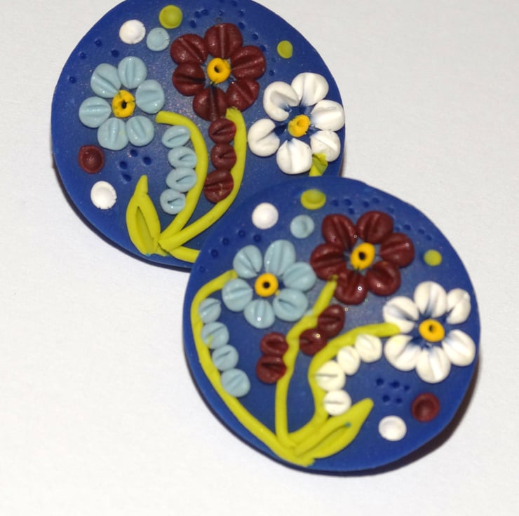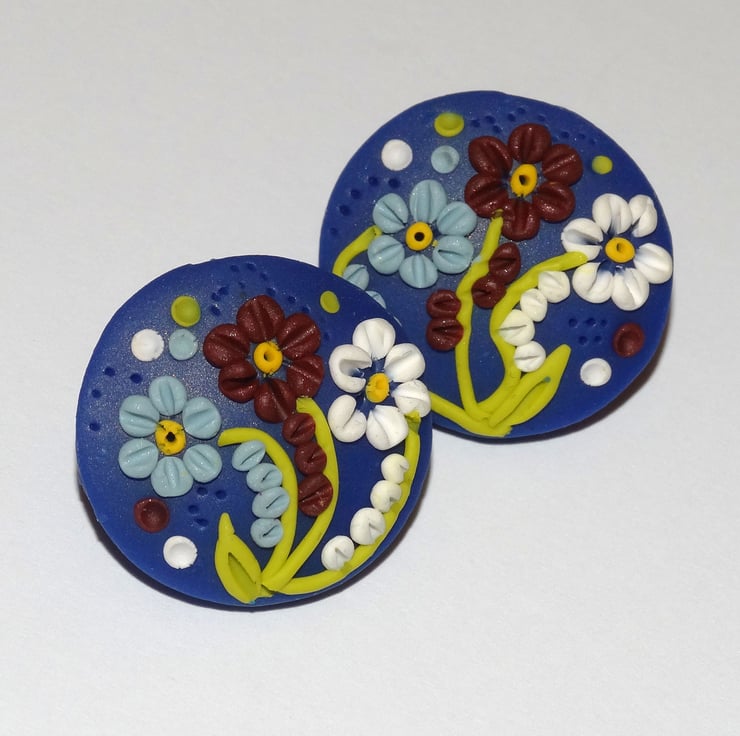 Hand made by me using polymer clay. The earrings have a deep blue background with mica inclusions to give a subtle shine. The earrings are decorated with white, pale blue and wine coloured flowers using the appliqué technique.