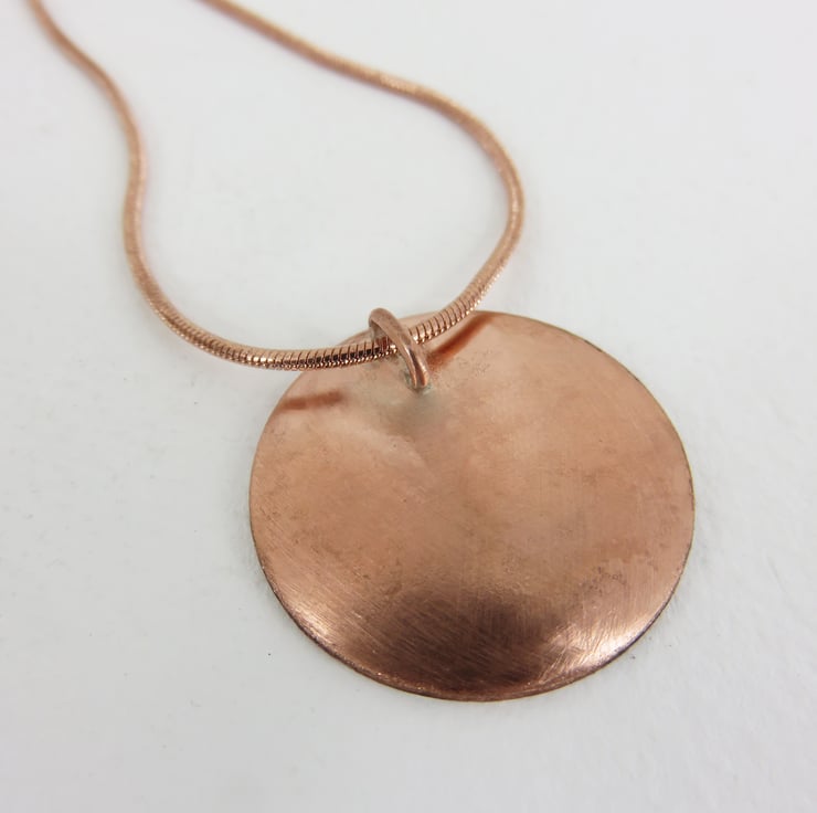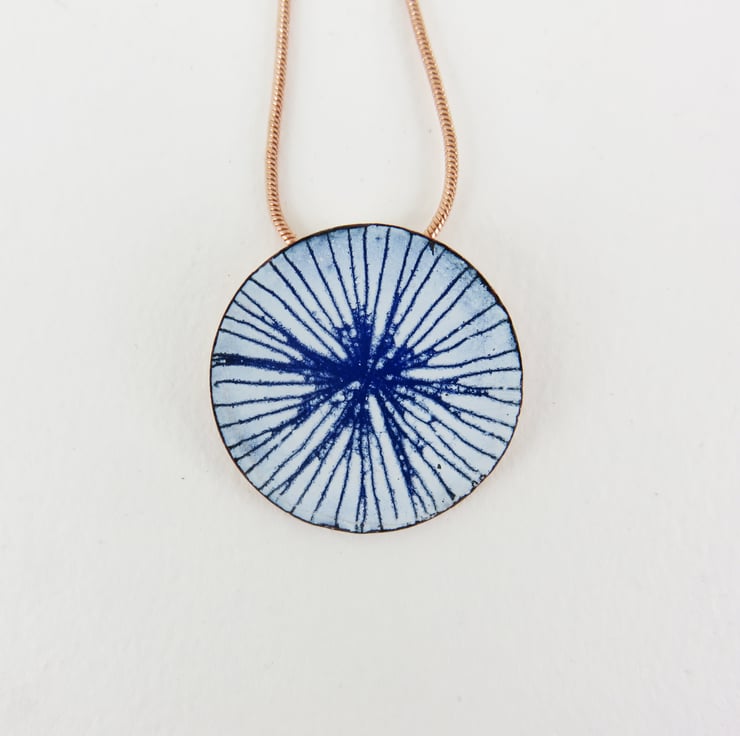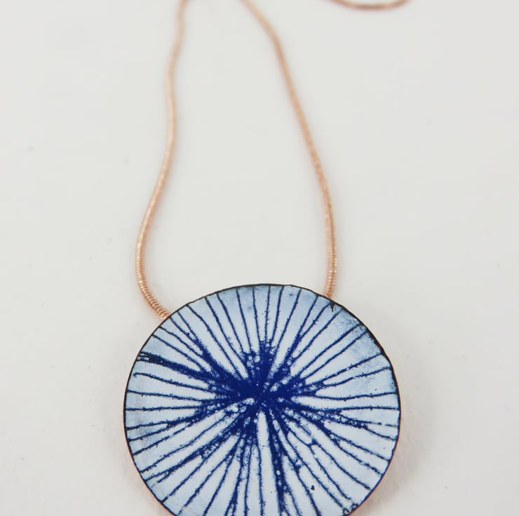 This round copper pendant measure approximately 30mm in diameter. It has a loop soldered on the back with a 18in rose gold plated snake chain attached. There has been 2 layers of enamel laid down. The first is a layer of royal blue, followed by a layer of white. The white layer is drawn in to with a sharp object creating this unique, off off pattern. No two the same.