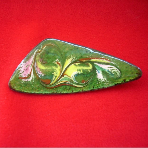 Over several coats of clear enamel built on the triangular copper shape I have added rods of brown enamel and scatterings of white, yellow and pink enamel powder. When the piece reached red hot in the kiln I drew through the surface with a steel point to create the unique, random, scrolled pattern. In some lights the copper beneath may be seen through the clear enamel, in tones of golden-brown.