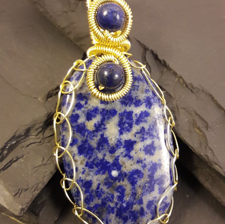 This pale example of lapis has been netted in gold-plated copper wire so that the maximum amount of the lovely stone can be seen. The generous bale will fit the free leather thong (choose black or brown), one of my separately listed collars or co-ordinated viking knit chains, or even a thin scarf. The coils are finished with 6mm lapis beads. The pendant is sizable at 6.7cm by 3cm (including the bale), but is quite thin, so is not heavy to wear.