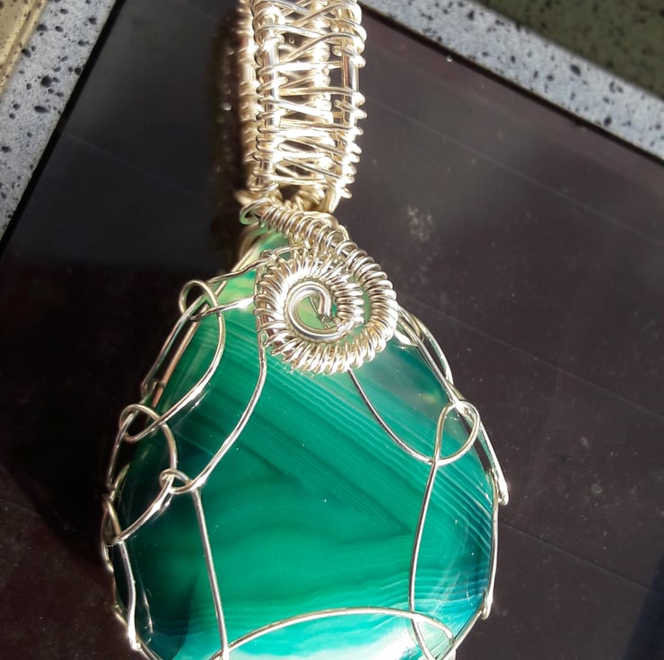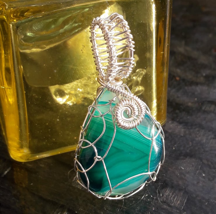 This gorgeous teardrop of striped green onyx has been delicately netted in silver plated copper wire, to maximise the view of this lovely stone. The pendant comes with a free leather thong (choose from black or brown in the buyers notes), but would also look great on one of the collars listed separately or a viking knit chain (soon available or contact me). It is 5cm by 2.5cm including the bale.