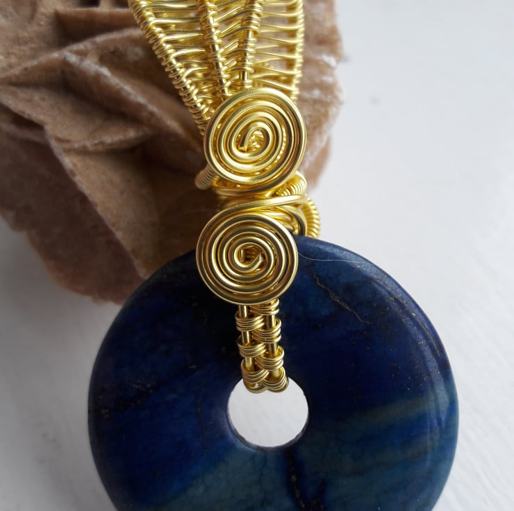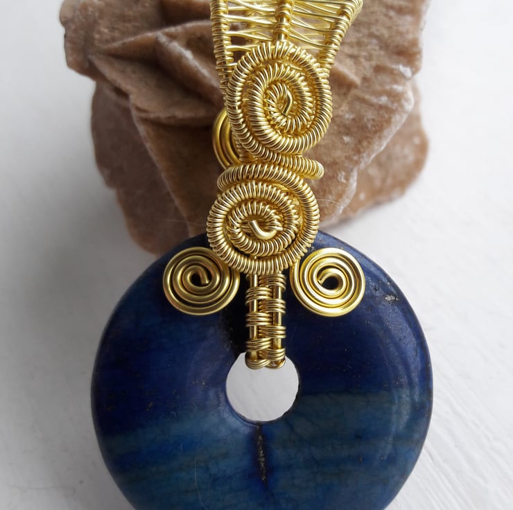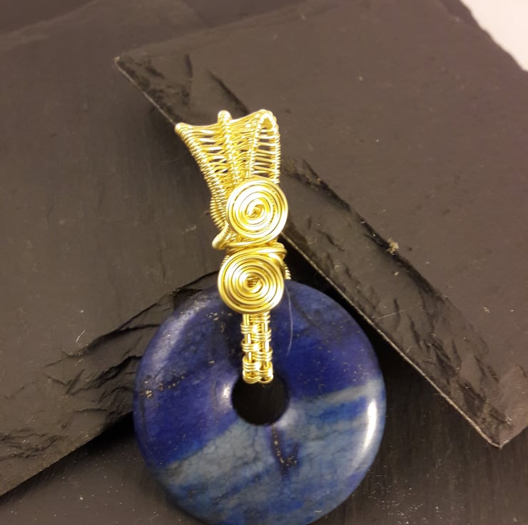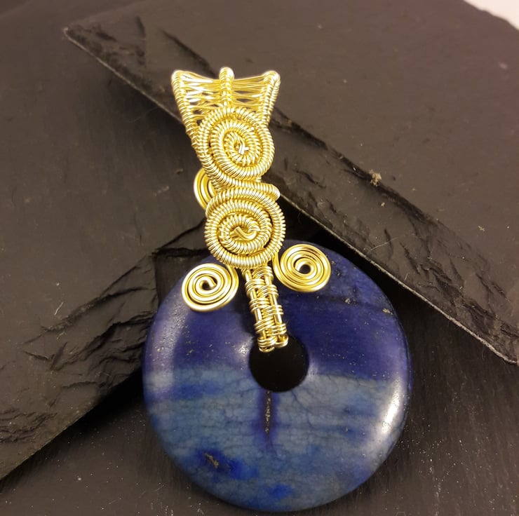 This vibrant lapis lazuli donut is wire wrapped with gold plated copper wire (with hypoallergenic coating). There is a different design on each side, in case you fancy a change. The donut is 4cm or 1.5in in diameter and the total length with the bale is just over 6.5cm or 2.5in. It comes with a free leather thong( choose from black or brown in the buyers notes), 19in with 2in extender. The bale is generous enough for a viking knit chain or collar, which will be listed separately.