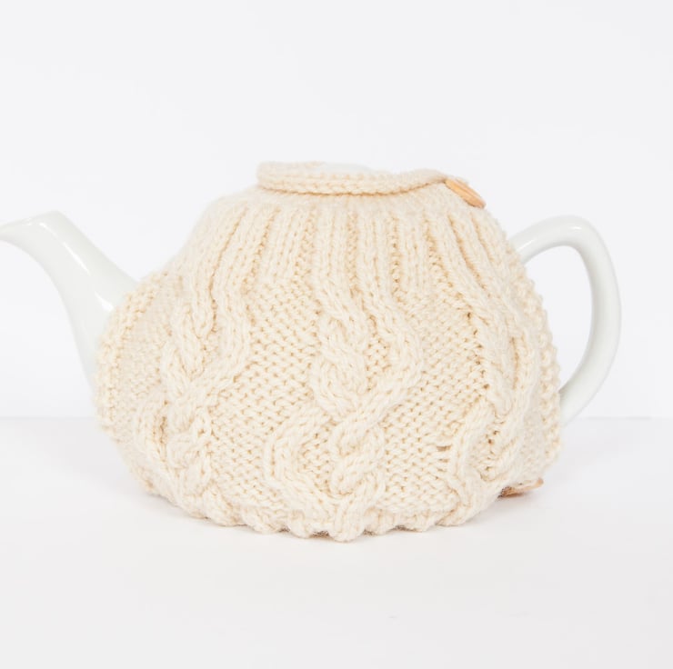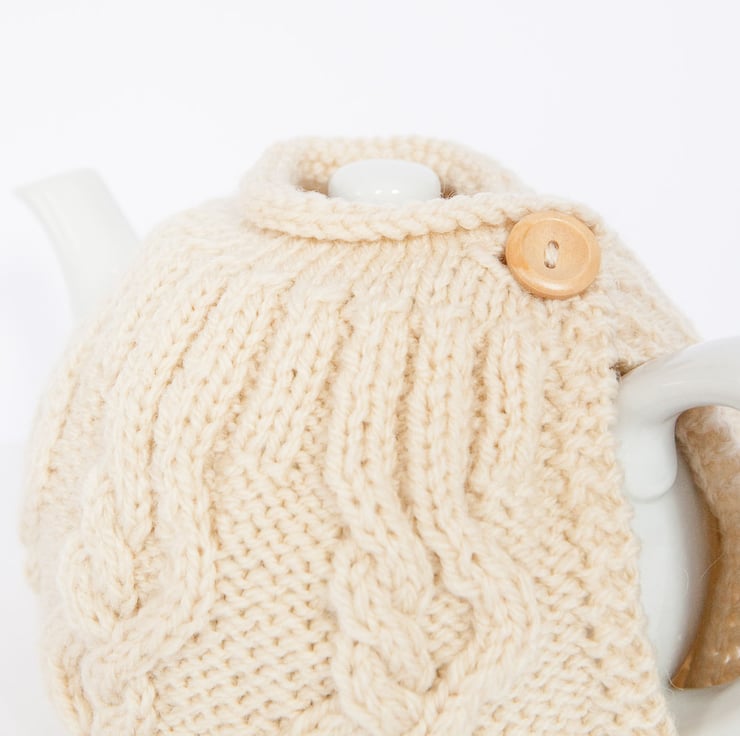 This contemporary tea cosy was hand knitted using a cable pattern in a lovely thick yarn. It was designed to keep your tea warm for longer. It is finished off with a gorgeous wooden buttons to fasten it around your pot.