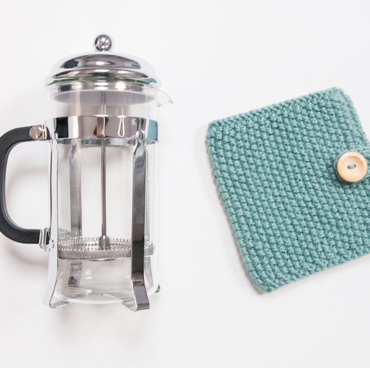 This listing is for a ready to ship, knitted French Press Coffee Cosy / Coffee Press Cosy in Teal.