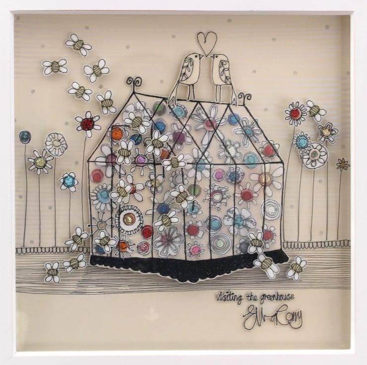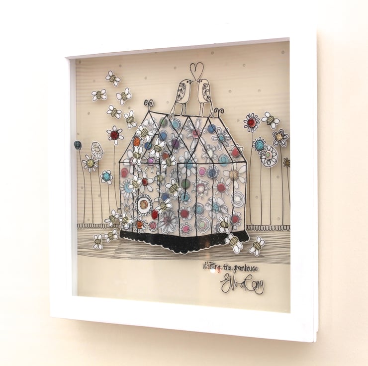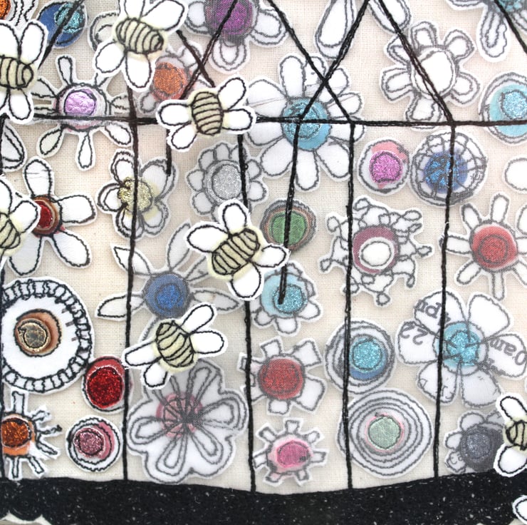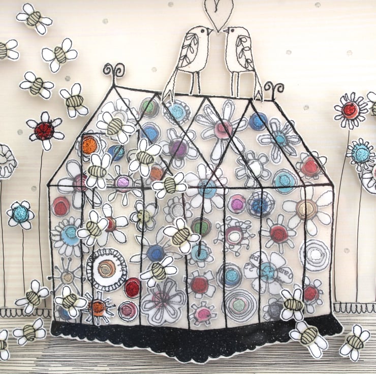 'Visiting the Greenhouse' is created using freehand machine embroidery, multiple layers of cloth, hand printed fabric and appliqué.