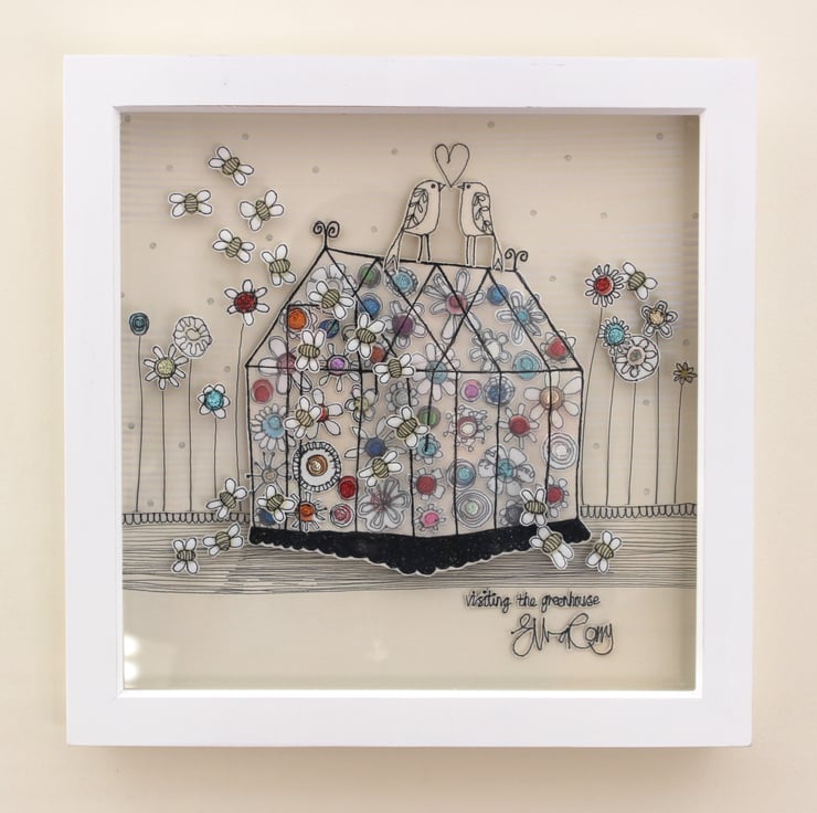 A white washed box frame measuring 35cm by 35cm square, encapsulates the piece which is mounted on an off white background with painted iridescent lines and dots.
