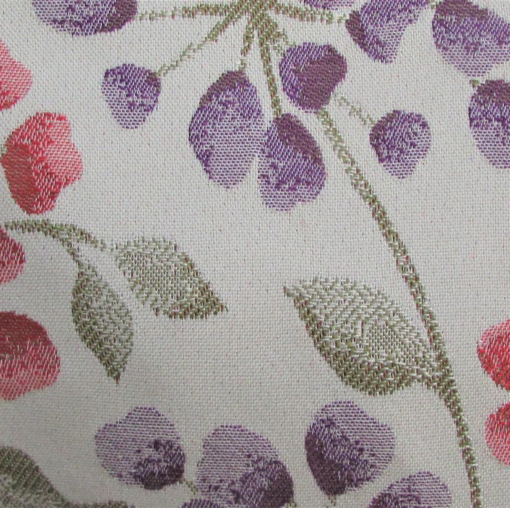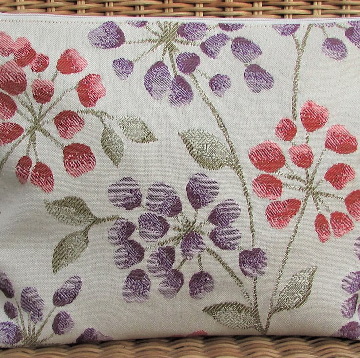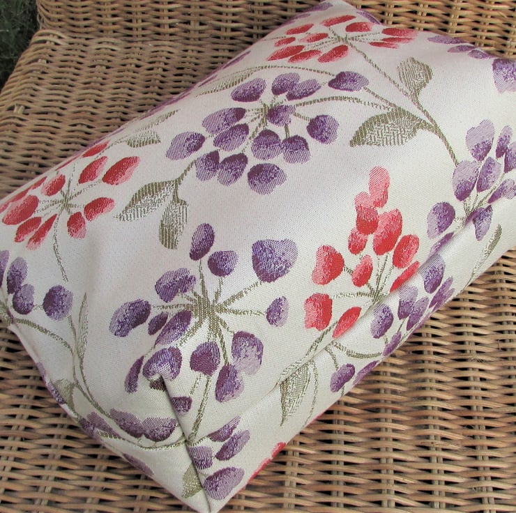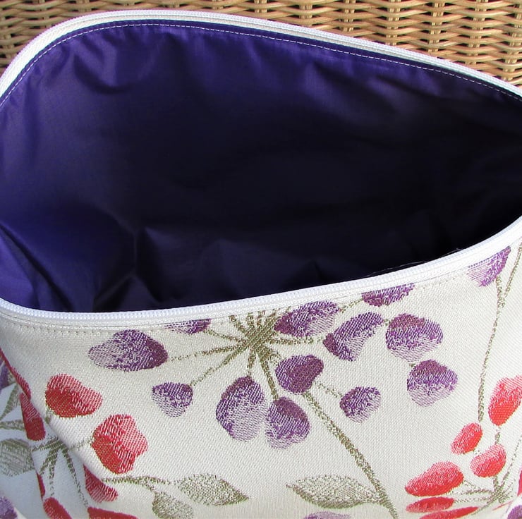 A handy toiletry bag in cream fabric with a pretty woven floral pattern in red and purple with olive green leaves. The bag fastens with a cream zip and the inside is fully lined with a purple water-resistant lining. The base of the bag is boxed giving a spacious interior.