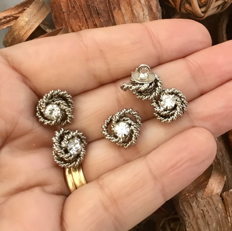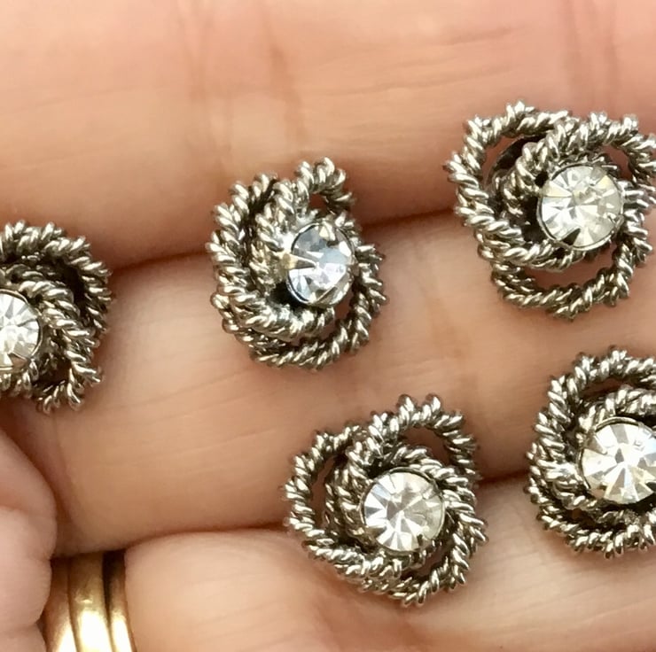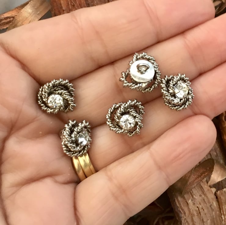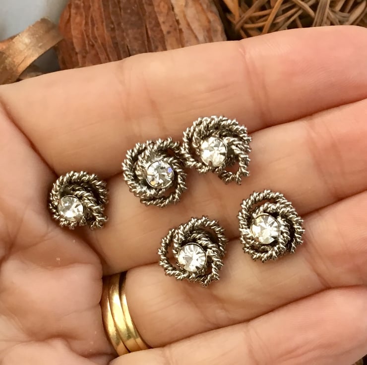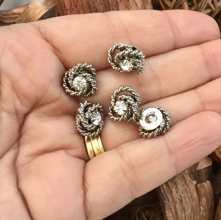 Prestige Set of Five Knot and Facetted Crystal Buttons. Stunning set, silver tone metal twisted knot buttons, each with a claw set faceted clear crystal glass centrally set within each button.