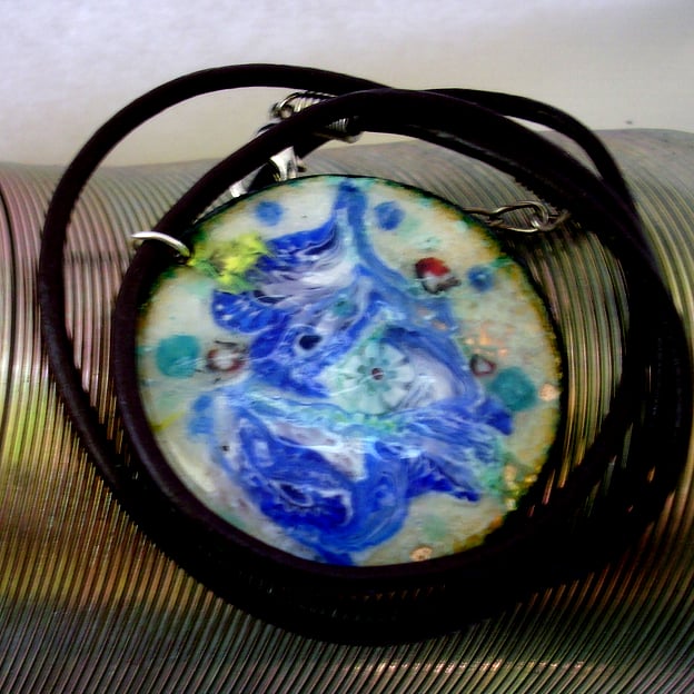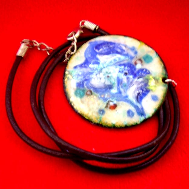 After building up a base of several layers of clear enamel on the copper shape I added a layer of white enamel. To this I added a acattering of small lumps of blue enamel and some beads, some millefiore, and frit, broken pieces of enamels. While the piece was at red hot in the kiln I drew through the enamel with a steel point to make the unique, random patterns. In smme lights the copper beneath shows through, adding golden brown tones to the overall effect.