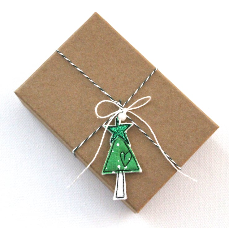 Each tree is created using multiple layers of cloth, sewn using freehand machine embroidery and then cut out by hand. There is a sewn glitter fabric star and heart on each, a glass bead and bakers twine to attach to your parcel.