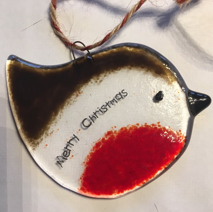 A beautiful handmade Robin made from fused glass and overprinted with the words Merry Christmas. This Robin will make a lovely addition to your Christmas decorations and looks beautiful hanging from the tree. Please note that as each item is handmade it may differ slightly from the photos