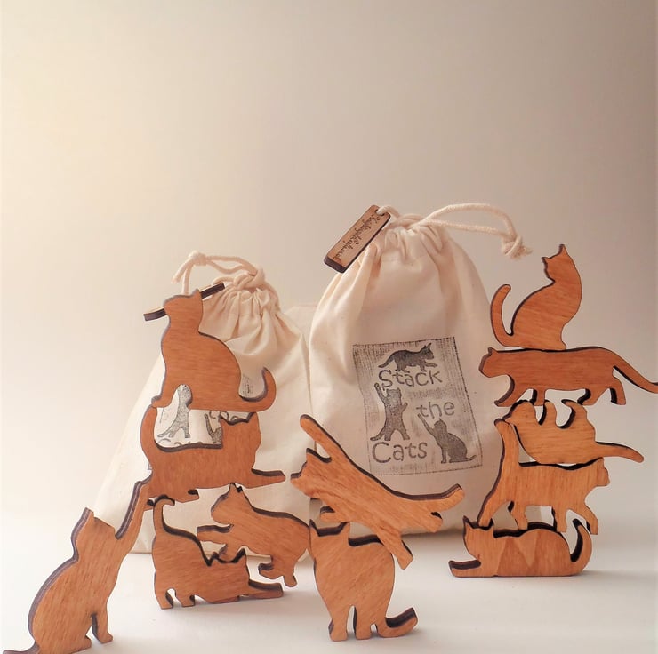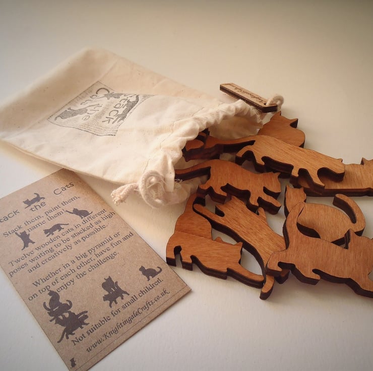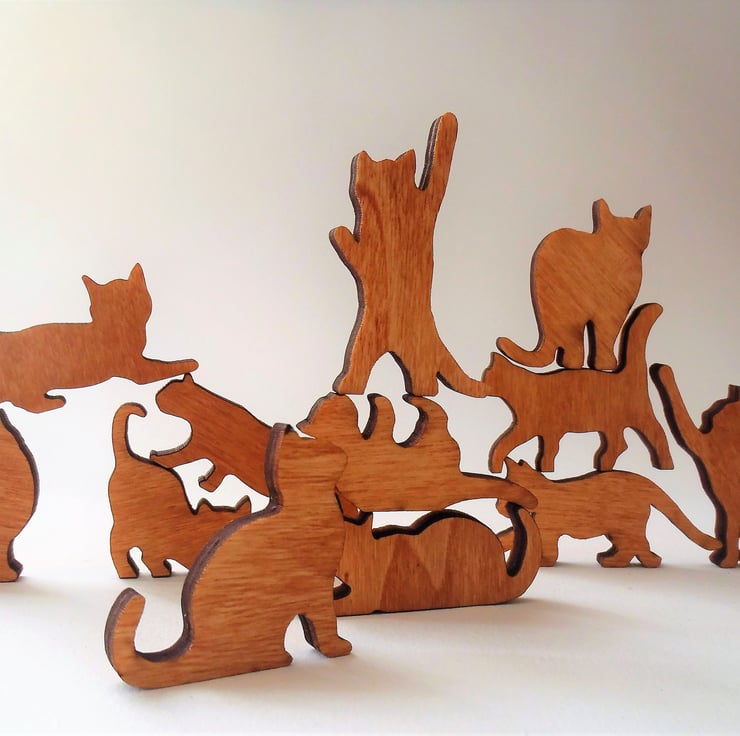 A unique gift for cat lovers. Twelve miniature wooden cats in different poses waiting to be stacked as high and creatively as possible.