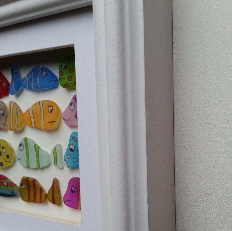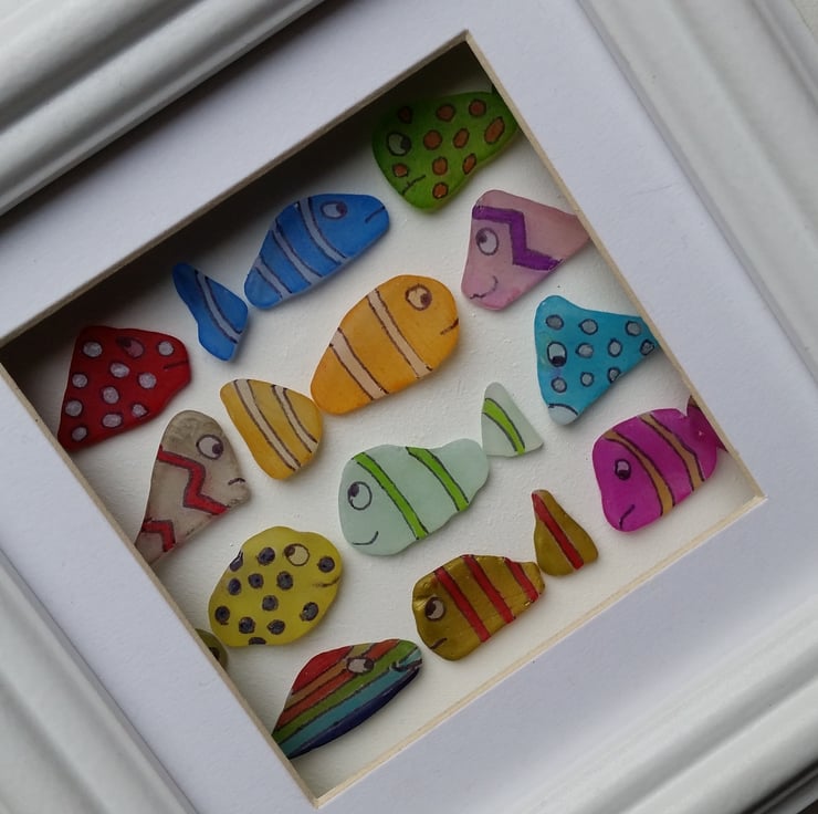 It seems entirely apt that these colourful little fish came out of the sea. They are made from pieces of surf tumbled sea glass - glass tossed into the sea many years ago that has been shaped and smoothed by the movement of the sea and sand before being picked up from the beach by me to create this little piece of art set inside a 20x20cm glazed box frame that will stand alone or hang on the wall.