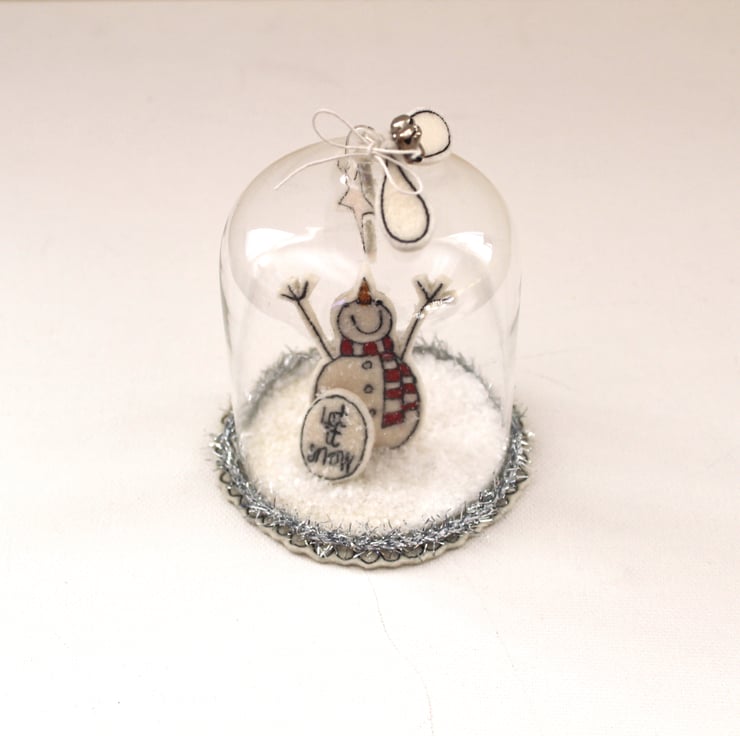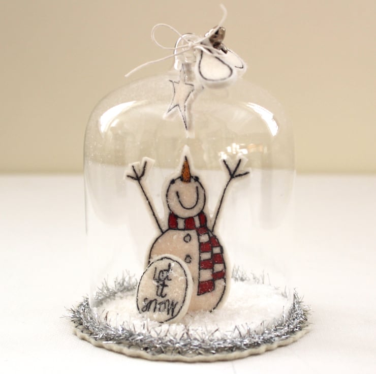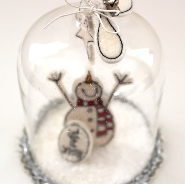 Mr Snowman is created using free hand machine embroidery and 100% wool felt. He is encapsulated within a glass dome, with snow (not real, sorry), a star, bells and a sign 'let it snow'. Delicate tinsel finishes of this delightful Christmas decoration.