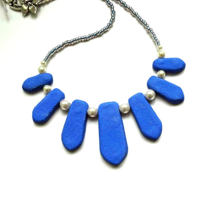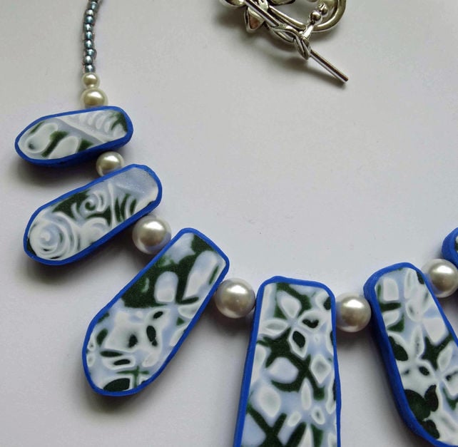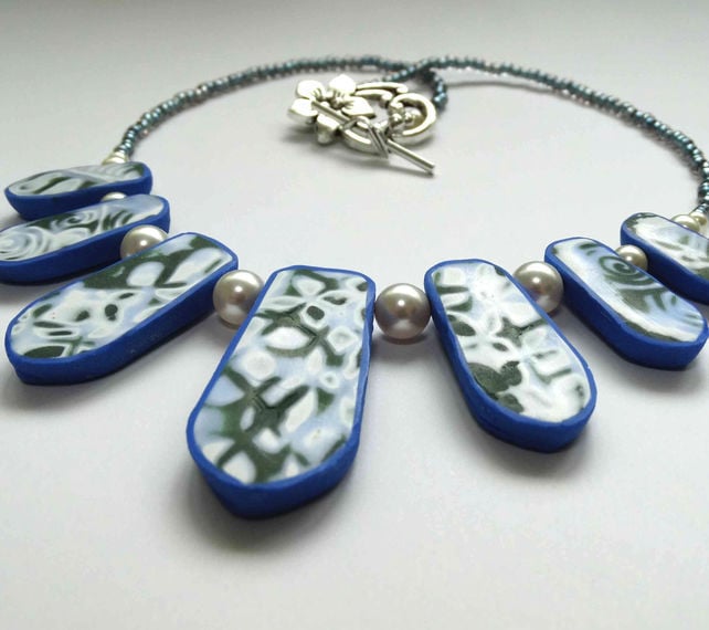 The focal points of this necklace are the hand made spear shaped polymer clay beads. I make the thin polymer clay veneers and apply them to the front of the beads. The back of the beads has been covered with textured plain blue clay to offset the dark green, pale blue and white pattern scheme on the front of the beads. These attractive beads are strung with swarovski white pearls as spacers between them and then the necklace is finished with small pale blue seed beads and a silver plated clasp.