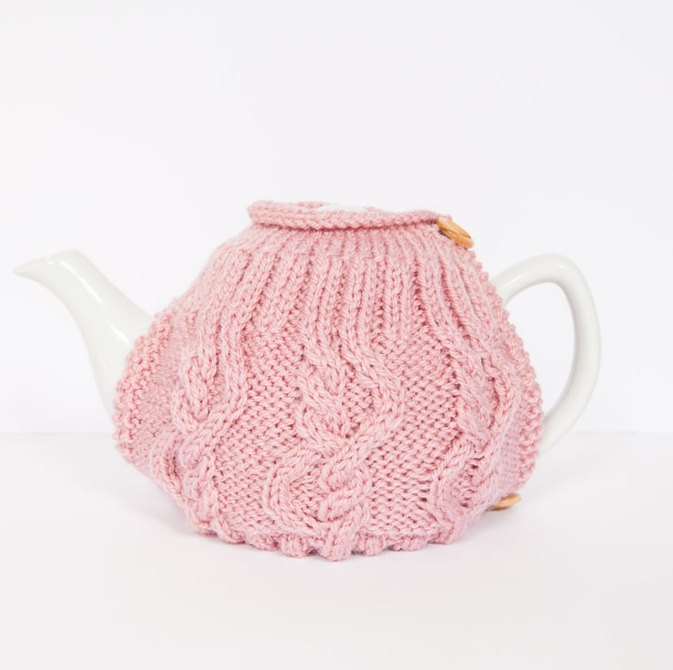 This contemporary tea cosy was hand knitted using a cable pattern in a lovely thick yarn. It was designed to keep your tea warm for longer. It is finished off with a gorgeous wooden buttons to fasten it around your pot.