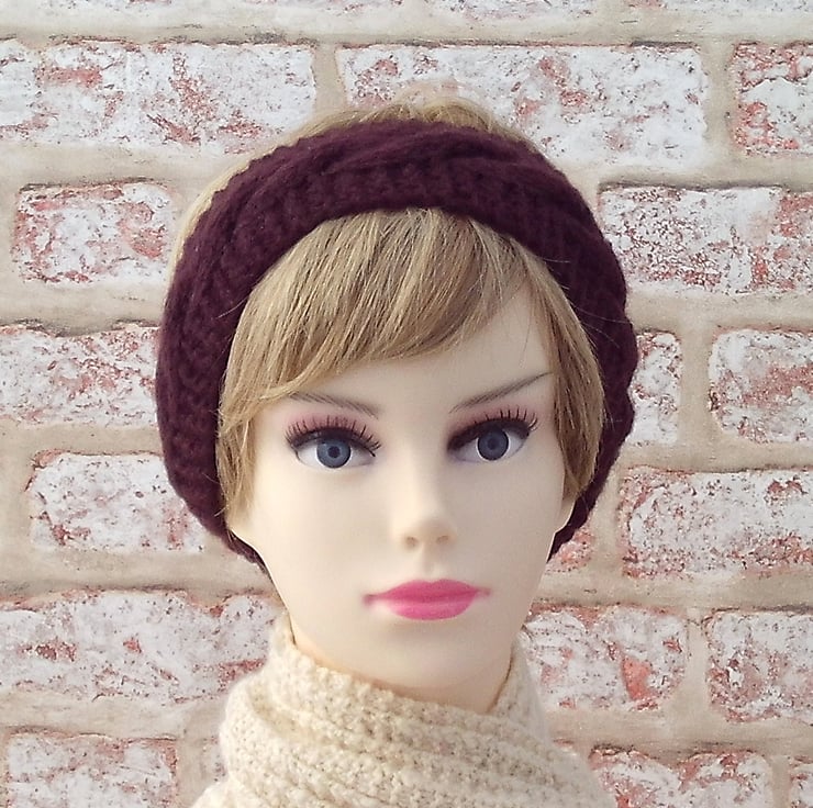 British wool hand knit earwarmer headband. I have hand-knit this stylish hairband from a deep wine maroon shade of pure British wool in a cable design. It is naturally stretchy for a comfortable fit.