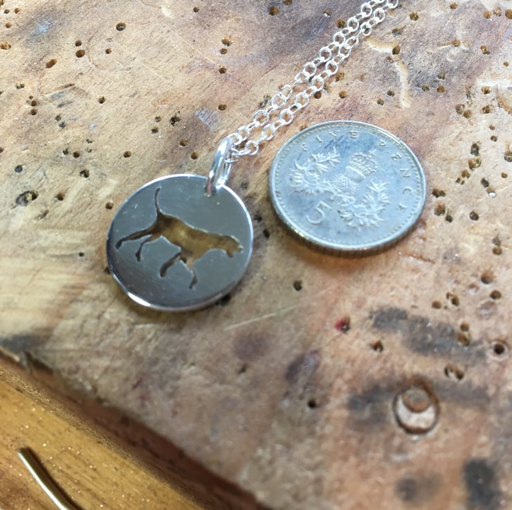 Made using a saw, a file, a hammer, pliers, a drill, silver solder and quite a bit of elbow grease . This dainty 18" necklace is light enough to wear as an everyday piece and is perfect for dog or animal lovers.