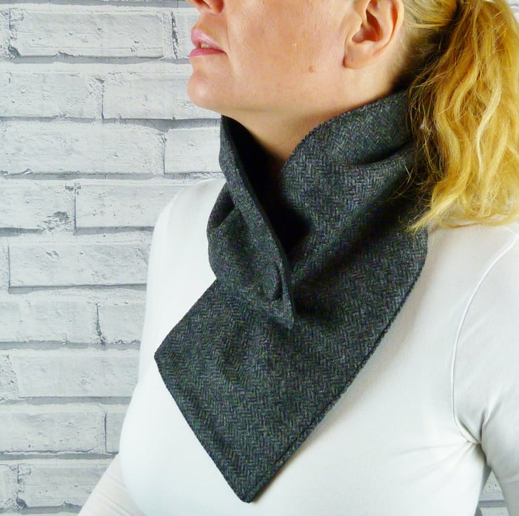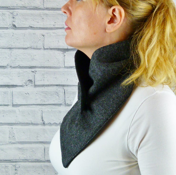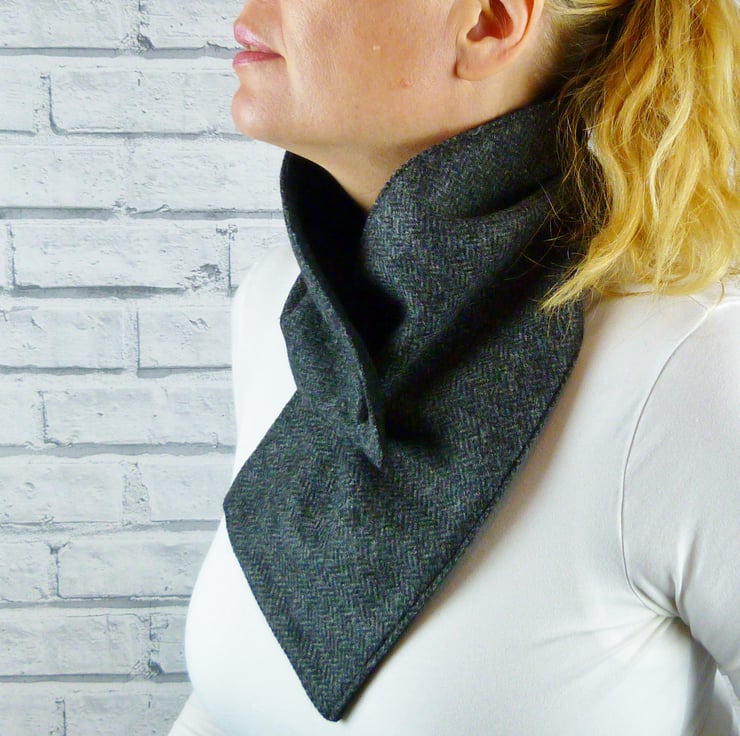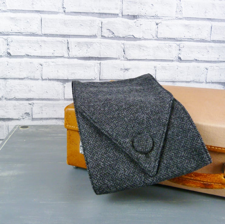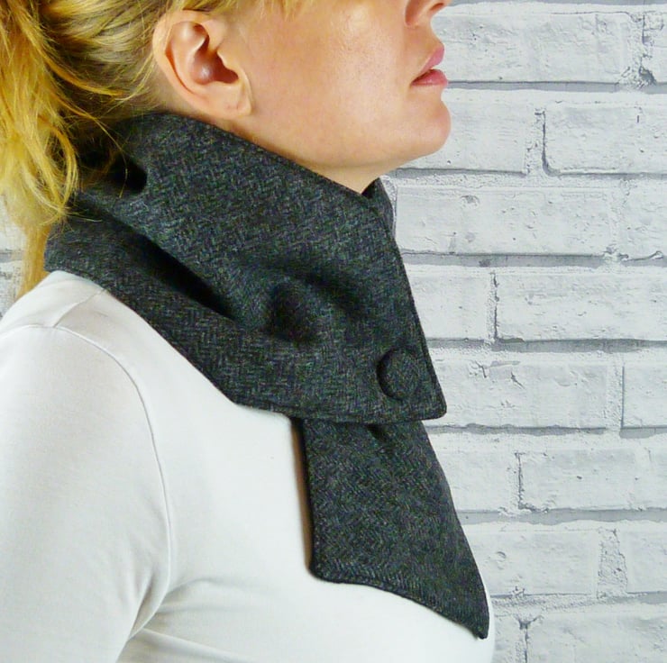 A stylish buttoned scarf handmade from this quality charcoal Yorkshire tweed fabric. For snugglyness the scarf is fully lined with a polar fleece fabric. The neckwarmer fastens with a handmade button.